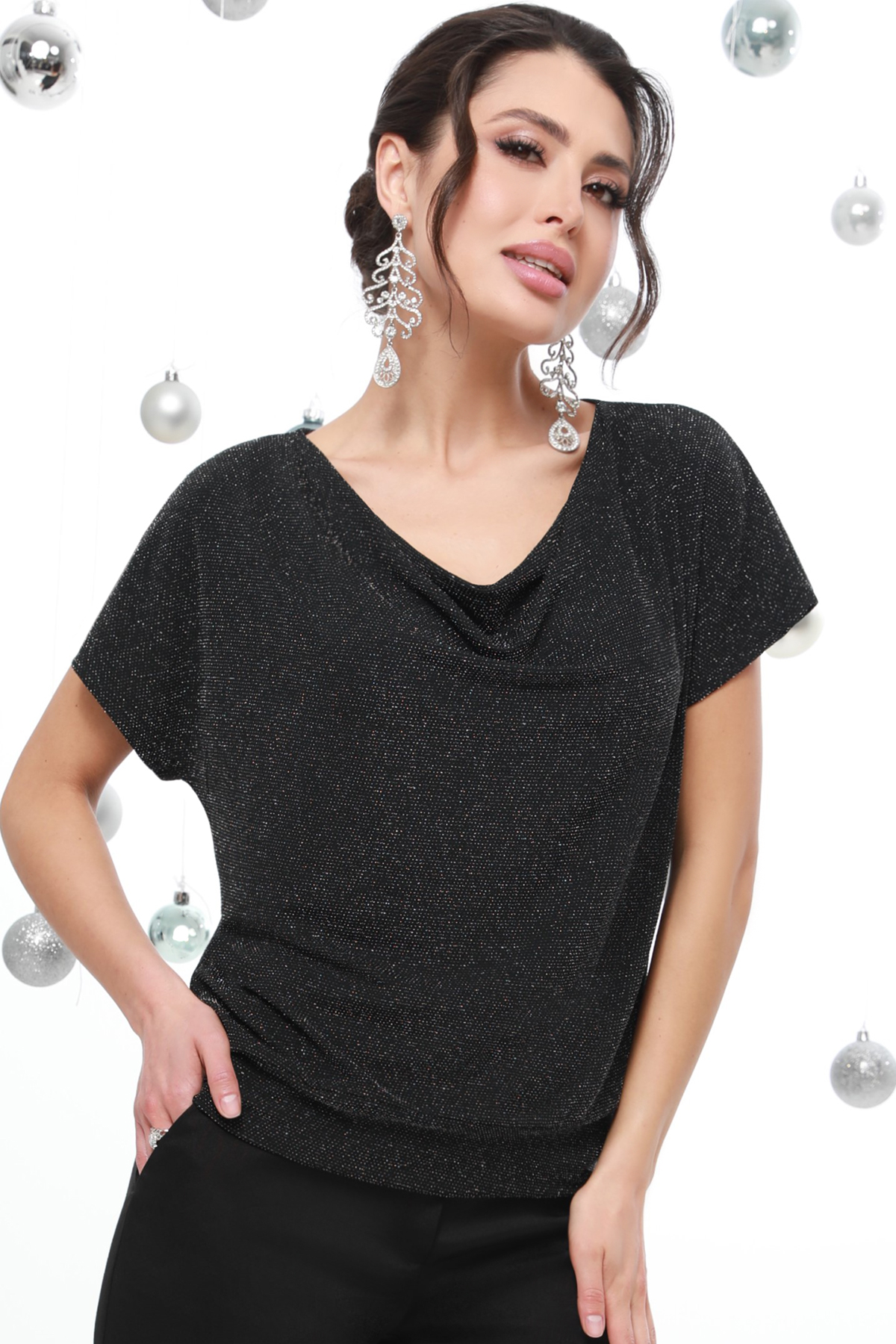 Эффектная трикотажная блузка с люрексом — нарядная модель, которая окажется в центре внимания на любом празднике, а также станет главным украшением повседневного образа. Полуприлегающий фасон с коротким рукавом, вырезом-качели и мягкой драпировкой выглядит нежно и привлекательно, визуально удлиняет шею и скрывает недостатки в области талии. Широкий манжет по низу блузки позволяет регулировать посадку и носить изделие с легким напуском или без него. Мягкая трикотажная ткань с металлическим блеском — не только изюминка модели, но и один из главных трендов сезона зима 2024. Чтобы вечерний образ выглядел роскошно и со вкусом, дополните блестящую блузку базовым однотонным низом, лодочками на каблуке и парой акцентных украшений. Изделие требует бережного ухода, поэтому рекомендуется стирать его в деликатном режиме без отжима.