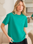 Свободный крой блузки и спущенная линия плеча дарят ощущение легкости и непринужденности, делая образ одновременно женственным и современным. Широкие рукава средней длины гармонично дополняют образ и идеально подходят для полных рук, обеспечивая комфорт, свободу движений и уверенность. Аккуратная застежка на маленькую пуговицу добавляет утонченности, а круглый вырез красиво обрамляет шею, создавая аккуратную линию декольте.