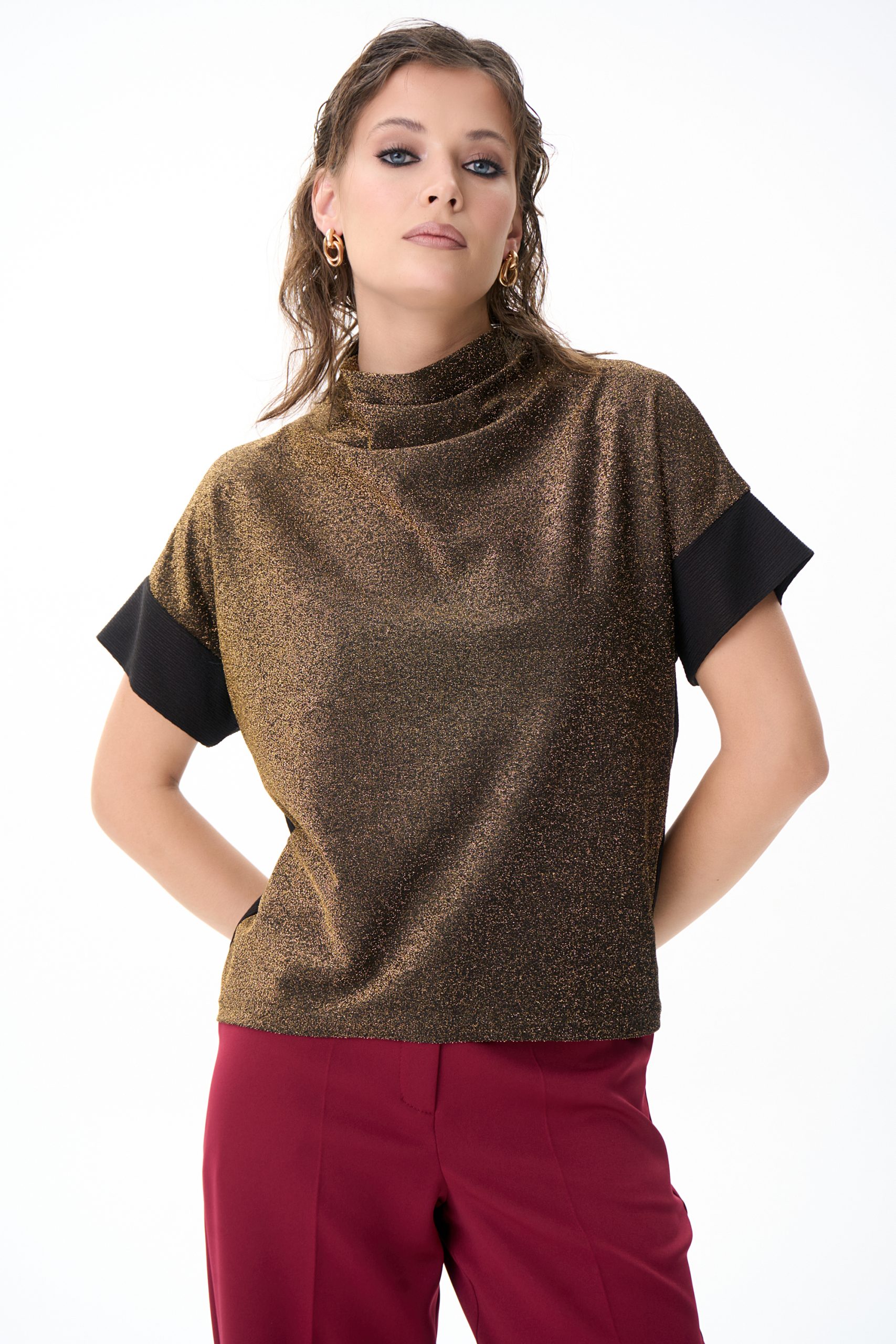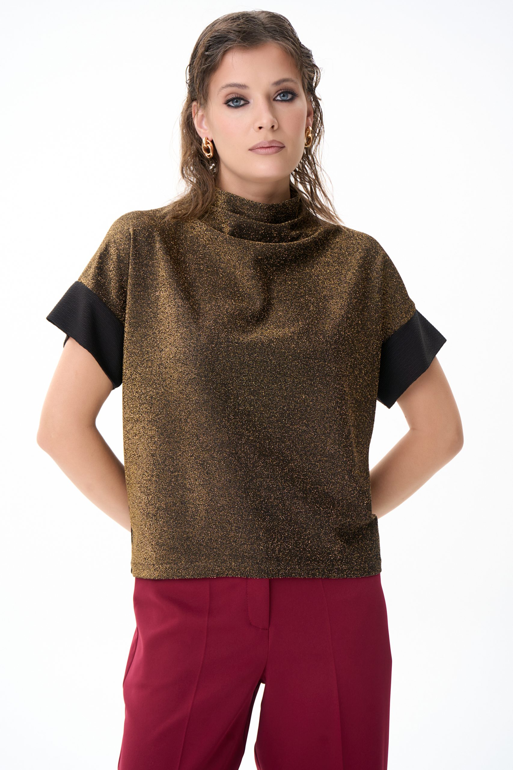 Туника «Лючия» — универсальная модель, выполненная из мягкого эластичного полотна с эффектным мерцающим покрытием. Лёгкий блеск ткани делает образ выразительным, но при этом остаётся в рамках сдержанной элегантности. Свободный силуэт комфортно садится по фигуре, не стесняя движений и визуально корректируя линию плеч. Укороченный рукав дарит аккуратный и женственный акцент, а мягкая драпировка в области горловины создаёт более утончённый вид. Туника сочетается с брюками, юбками и базовыми вещами, подойдёт и для повседневных образов, и для вечерних выходов. Лёгкая, универсальная и всегда уместная — модель, которая смотрится стильно без усилий.