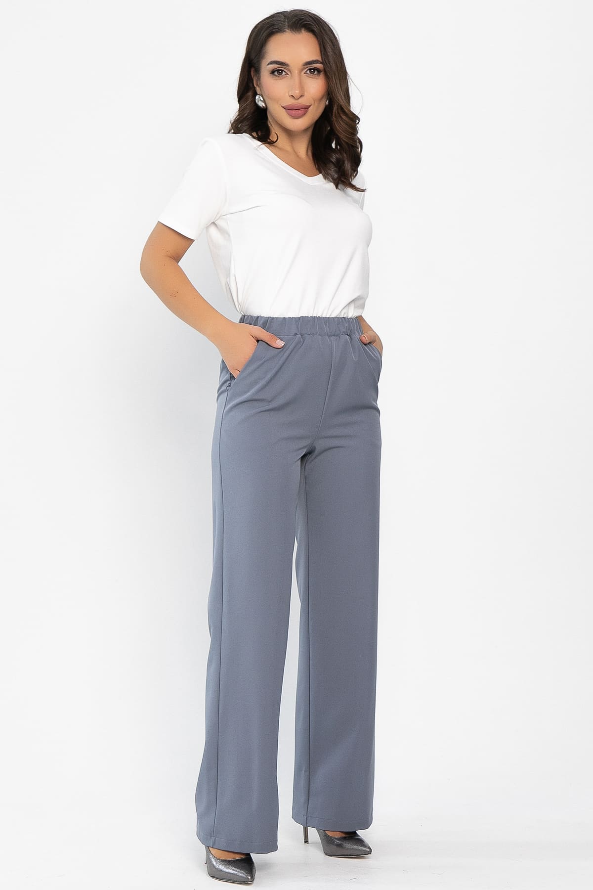 Классические брюки в серо-голубом цвете на резинке по талии подойдут для офисного и повседневного образа. Они не сковывают движений и выглядят стильно и лаконично. В боковых швах брюк есть удобные карманы. Универсальная длина. Брюки отлично смотрятся в сочетании с классическими рубашками или блузами, а также подойдут для создания расслабленного образа.