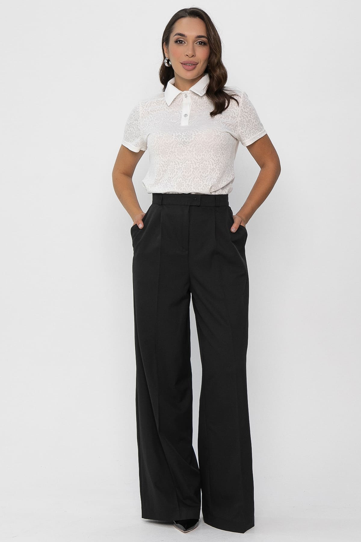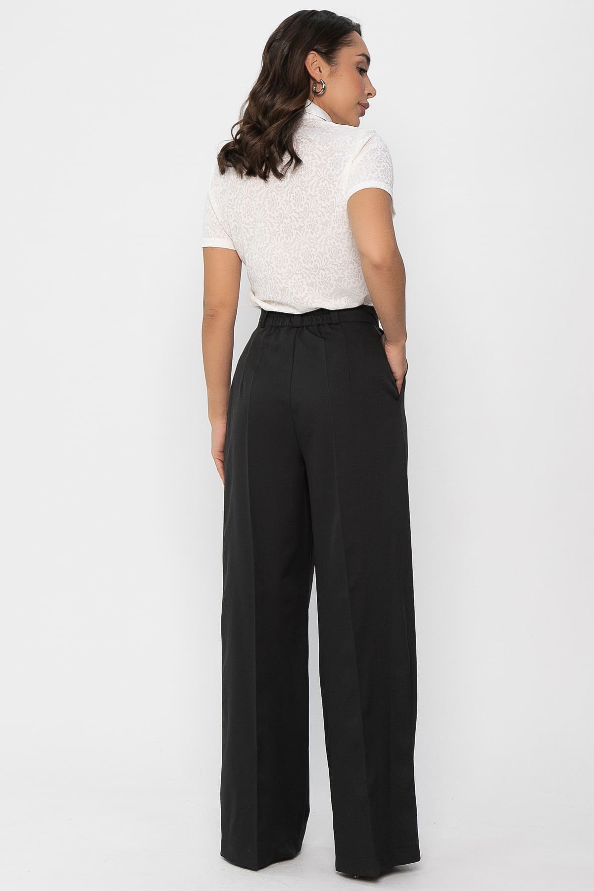 Комфортные классические брюки прямого силуэта. Свободный крой и притачной пояс с эластичной резиной по спинке обеспечивают безупречную посадку. Брюки оснащены молнией и пуговицей спереди, а также заложенными складками спереди и сзади. Высокая талия создает красивый силуэт, а карманы добавляют практичности. Низ изделия с широким подгибом.