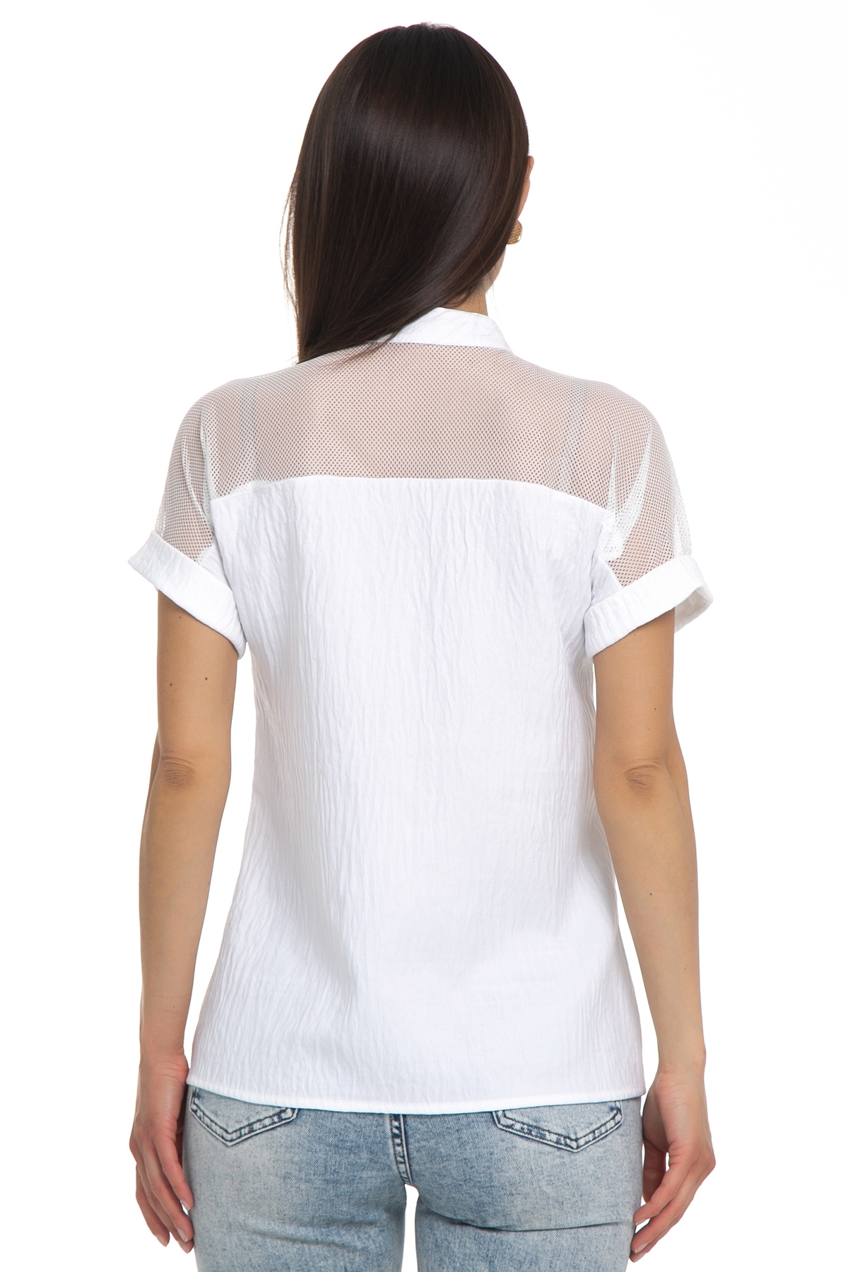 Не упустите шанс добавить в свою жизнь немного ярких красок и стиля! Оригинальная вискозная блуза   с аппликацией из цветочной композиции несомненно украсит ваш гардероб. Цельнокроеный рукав и кокетка  из сетки обеспечит комфорт и неповторимый стиль. Рукава дополнены манжетами.Перед блузки застегивается на пуговки. Белый