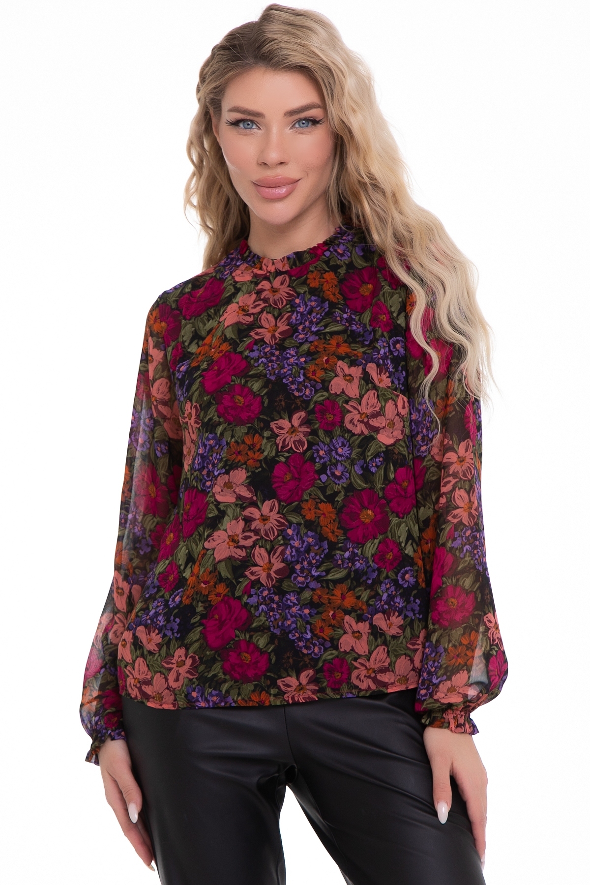 Очаровательная свободная шифоновая блузка, подчеркивающее женственность - отличное решение на каждый день или на праздник для современной стильной женщины. Шикарная модель с объемными длинными рукавами выполнена из высококачественного шифона. Круглая горловина оформлена рюшей с застежкой на пуговицу на спине.Нежная блузка  из шифона на трикотажном подкладе, по переду сделаны вытачки на грудь, рукава втачные пышные, длинные, снизу собраны на резинку.