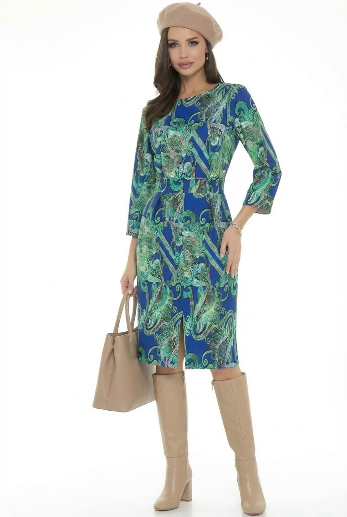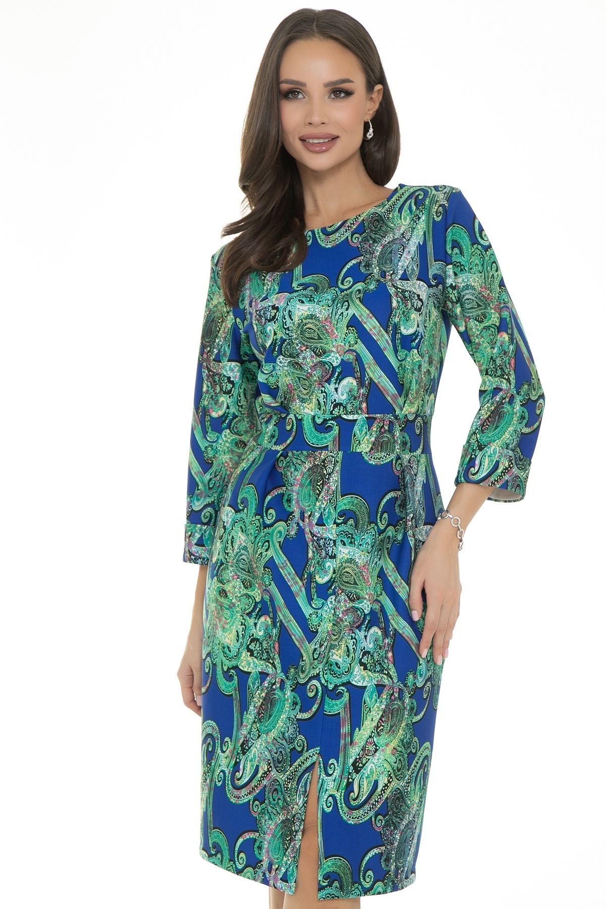 Элегантное праздничное платье Diolche, отличается невероятно красивым силуэтом. Это превосходное платье футляр в длине миди идеально сочетает современные тенденции с классическим стилем. Свобода и роскошь этого платья не оставят равнодушной ни одну женщину. Дизайнерский принт  и изысканный силуэт создают яркий, стильный и модный образ. Нарядное платье футляр с рукавом 3/4, выгодно подчёркивает фигуру, скрывая недостатки. Горловина обработана обтачкой. Платье отрезное по талии, спереди сделаны складки. Сзади в средний шов вставлена молния.