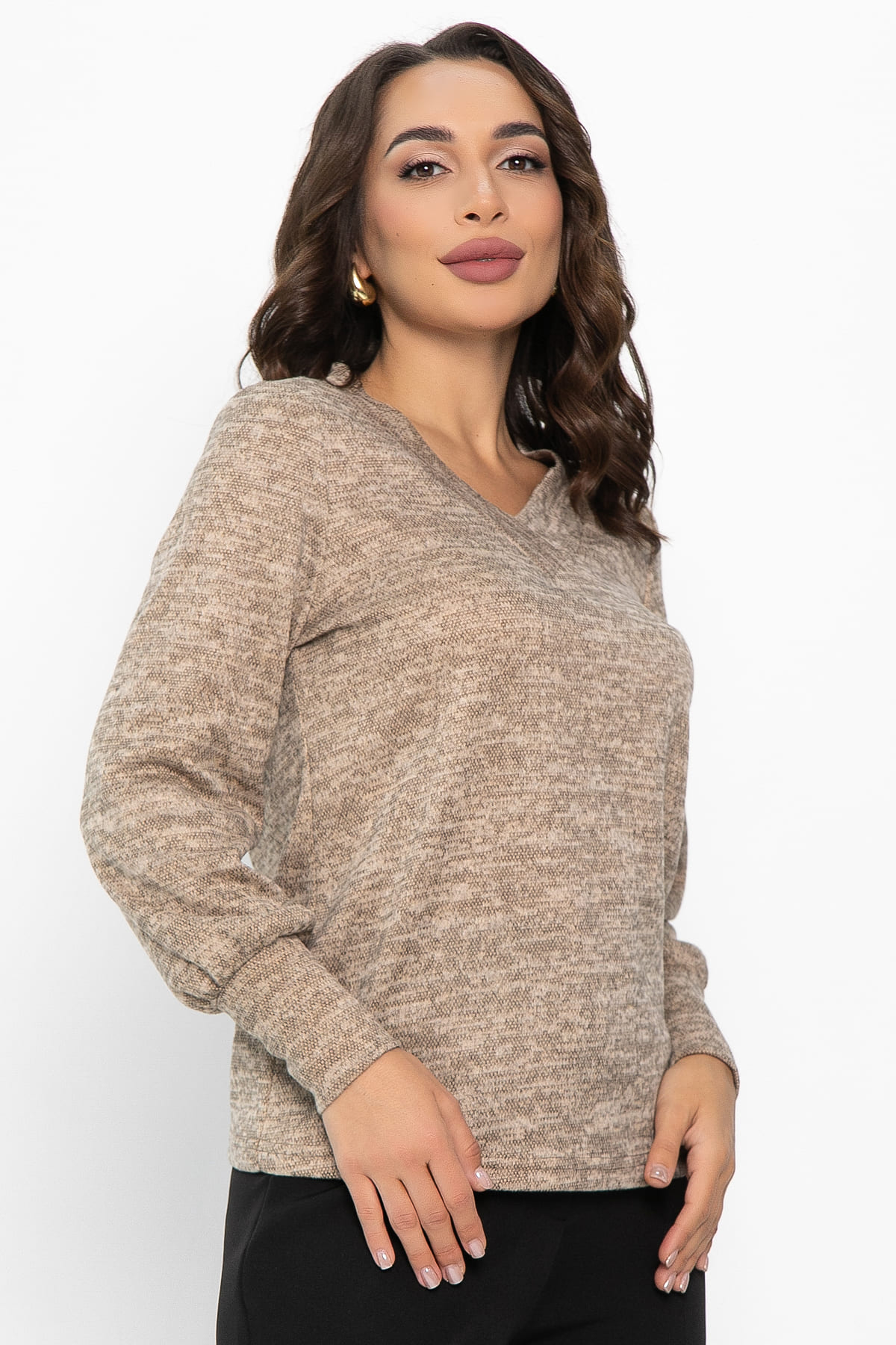 Базовый джемпер из мягкого трикотажа в песочном оттенке прекрасно подойдёт для создания повседневных образов. Длинные втачные рукава с широкими манжетами подарят комфорт в прохладное время года. Красивый V-образный вырез горловины - акцентная деталь, украшающая образ.