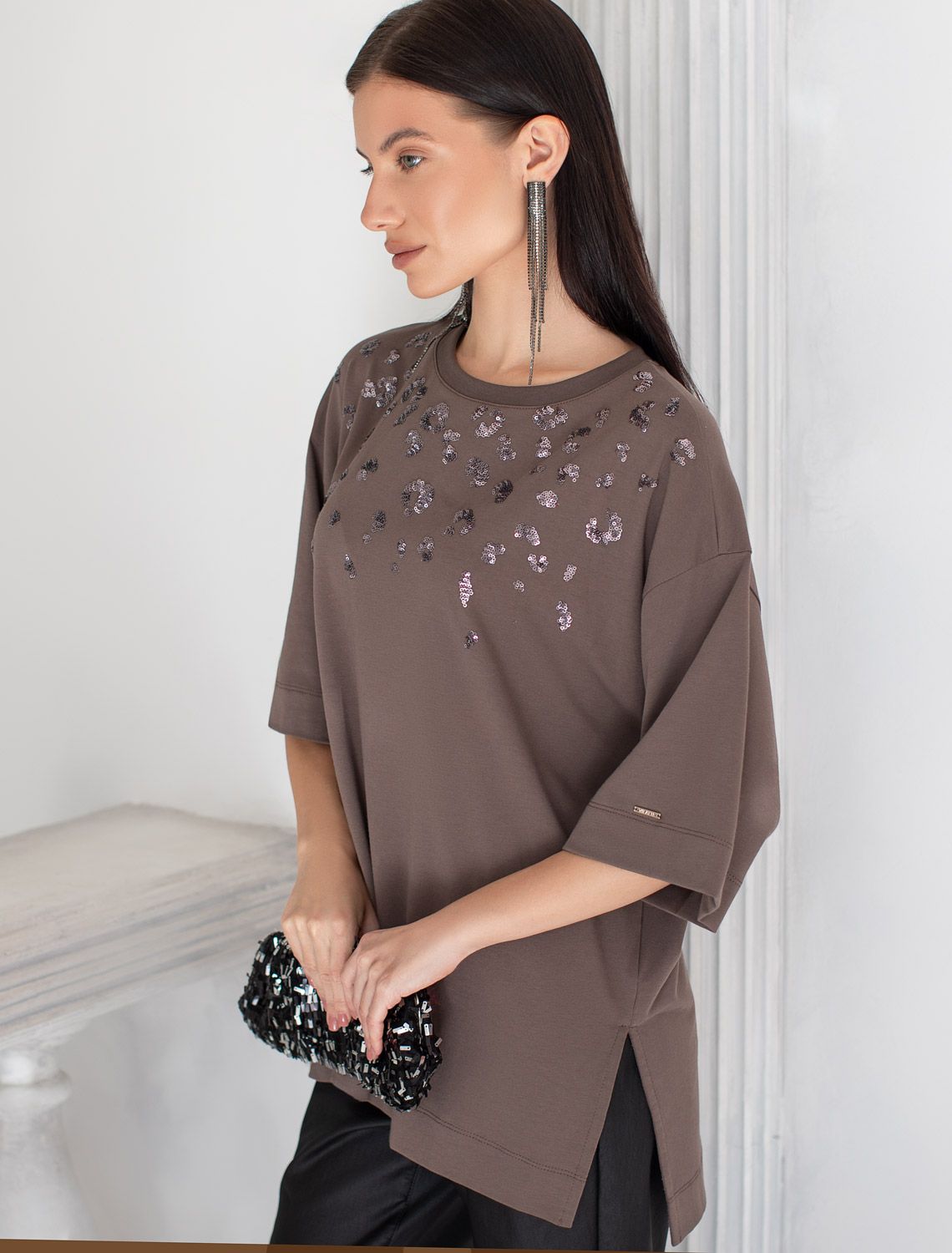 Состав: 92%Хлопок 8%ПУ Плотность:..показать 170 Г/м2Оверсайз футболка кофейного цвета из премиального хлопка с добавлением эластана создана для комфорта и стиля каждый день. Натуральный материал приятный к телу, дышащая ткань хорошо держит форму и подходит для повседневной носки дома, в офисе или на прогулке. Классический свободный крой, удлиненный прямой силуэт и свободная посадка делают эту базовую футболку универсальным решением для любой фигуры и роста, включая плюс сайз размеры и беременных девушек, отлично скроет животик. Широкие рукава держат форму и подойдут на полные руки. Нарядная футболка украшена авторским принтом пайетками, которые создают красивый мерцающий эффект. Такой акцент делает модель уместной как для особых случаев, так и для ежедневных образов.
