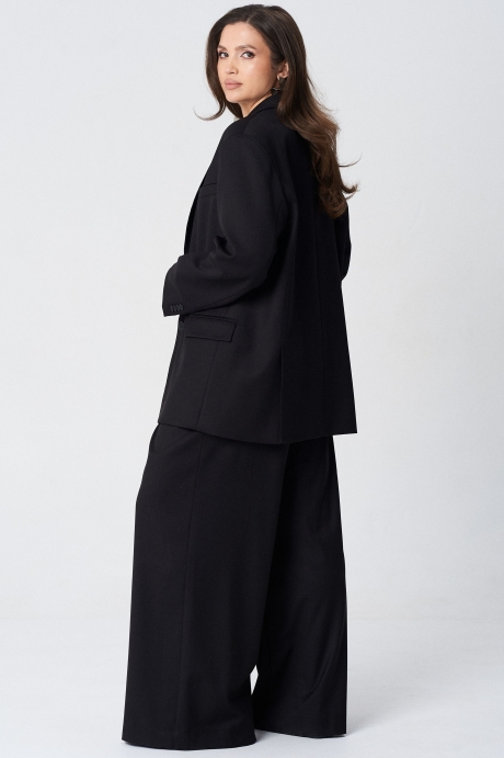 Жакет полуприлегающего силуэта на подкладке. Перед с декоративными вытачками, отрезным бочком, двумя прорезными функциональными карманами с клапаном и нагрудным карманом обманкой с листочкой. Спинка со средним швом и рельефами, в рельефах шлицы. Воротник пиджачного типа. Застежка центрально-бортовая застегивающаяся на 2 декоративных пуговицы и петли. Рукав длинный втачной со шлицей и с 4-мя декоративными пуговицами.
