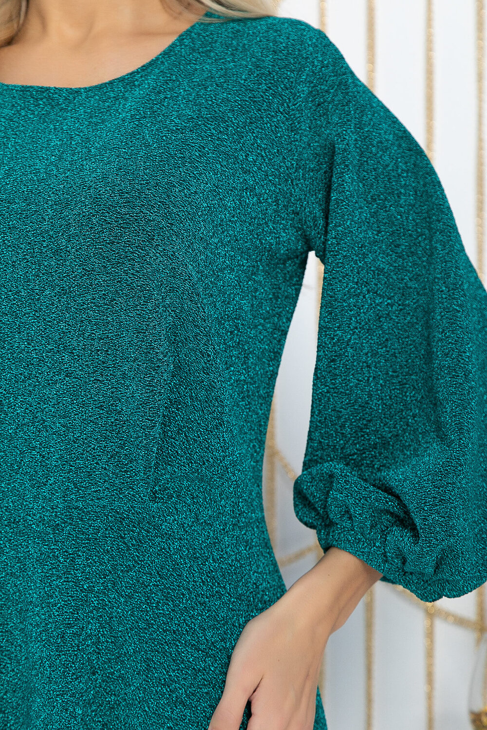 Вечернее платье из трикотажного полотна с люрексом - эффектная модель, которая окажется в центре внимания на любом праздничном мероприятии. Платье в длине макси, отрезное по талии. Втачной пышный рукав три четверти собранный по низу на резинку - изюминка платья, выглядит кокетливо и нежно. Округлый вырез горловины делает образ женственным и аккуратным. Ассиметричная расклешённая юбка придаёт платью лёгкую игривость. В комплект входит пояс из основной ткани, который позволяет подчеркнуть талию.