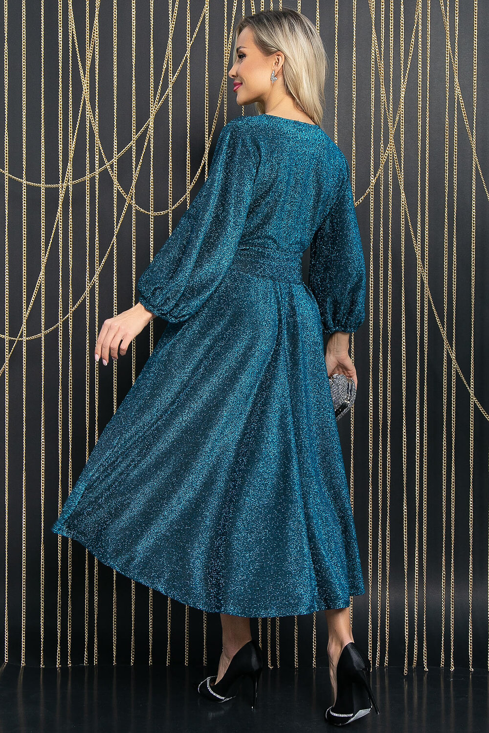 Вечернее платье из трикотажного полотна с люрексом - эффектная модель, которая окажется в центре внимания на любом праздничном мероприятии. Платье в длине макси, отрезное по талии. Втачной пышный рукав три четверти собранный по низу на резинку - изюминка платья, выглядит кокетливо и нежно. Округлый вырез горловины делает образ женственным и аккуратным. Ассиметричная расклешённая юбка придаёт платью лёгкую игривость. В комплект входит пояс из основной ткани, который позволяет подчеркнуть талию.