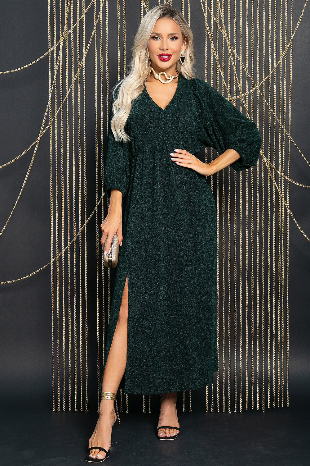 Погрузитесь в атмосферу роскоши и элегантности с нашим потрясающим платьем, выполненным из трикотажной ткани с люрексом. Это платье станет вашим незаменимым спутником на всех значимых мероприятиях — будь то свадьба, выпускной, вечеринка или любое другое важное событие. Разрез спереди придаст образу легкость и подчеркнет стройность ваших ног. Платье на резинке по талии, рукав 3/4 на резинке, что обеспечивает комфорт и удобство в носке.