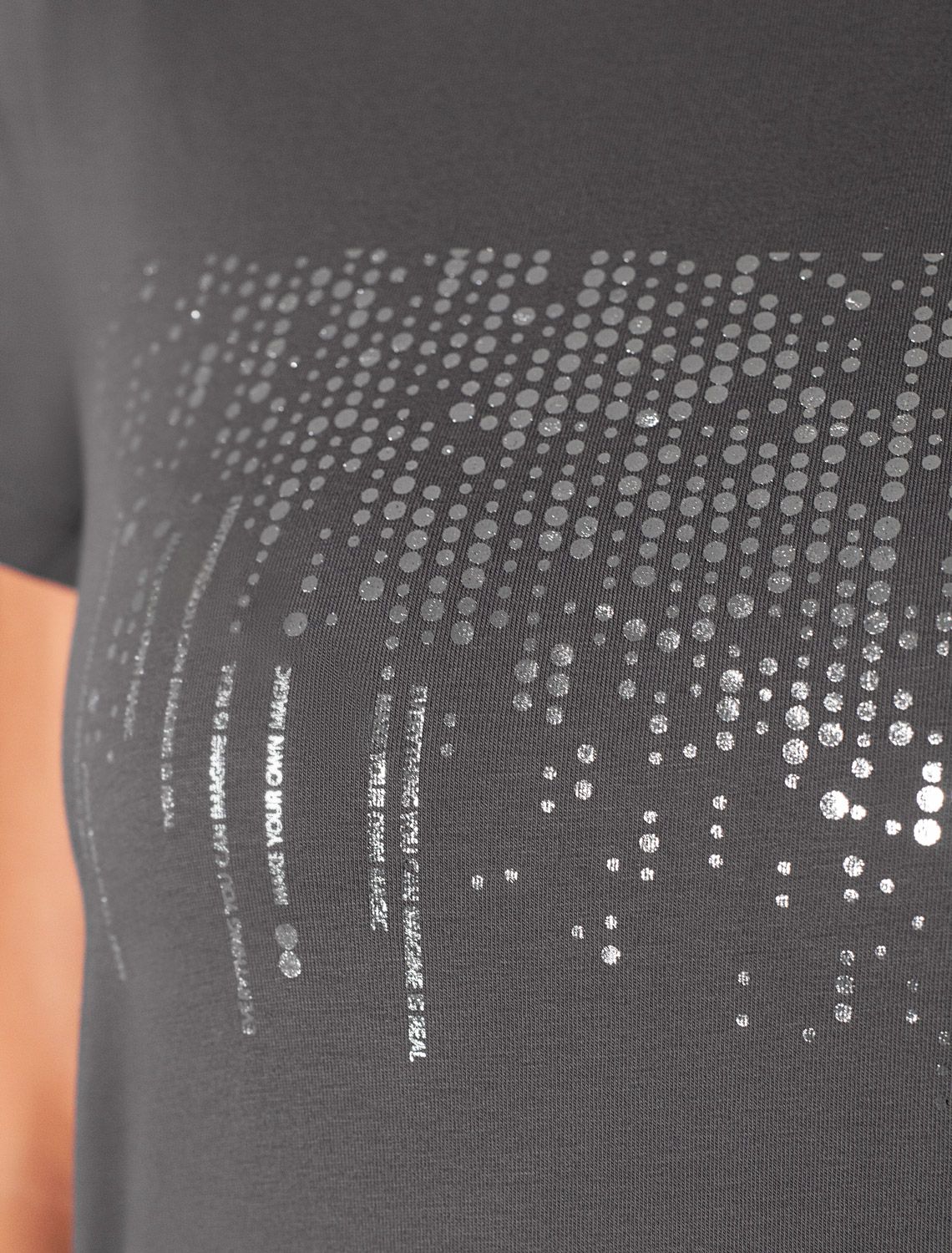 Стильная базовая футболка темно-серого цвета с серебристым принтом устойчивами красками выполнена из плотного хлопка с эластаном для комфортной посадки на любую фигуру. Прямая футболка классического кроя с круглым вырезом, прекрасно подходит для разных типов фигуры, в том числе и на большие размеры. Мягкость хлопка вместе с небольшой долей эластана гарантирует идеальную посадку и свободу движений. Легкая натуральная дышащая ткань премиального качества делает футболку с коротким рукавом идеальным вариантом для повседневной носки дома, на работу или офис. Однотонная футболка дополнена авторским аккуратным принтом, который придает праздничный и элегантный вид без лишней вычурности. Блестящий принт в виде дождика аккуратно украшает, добавляя изысканный акцент и создавая легкий мерцающий эффект.