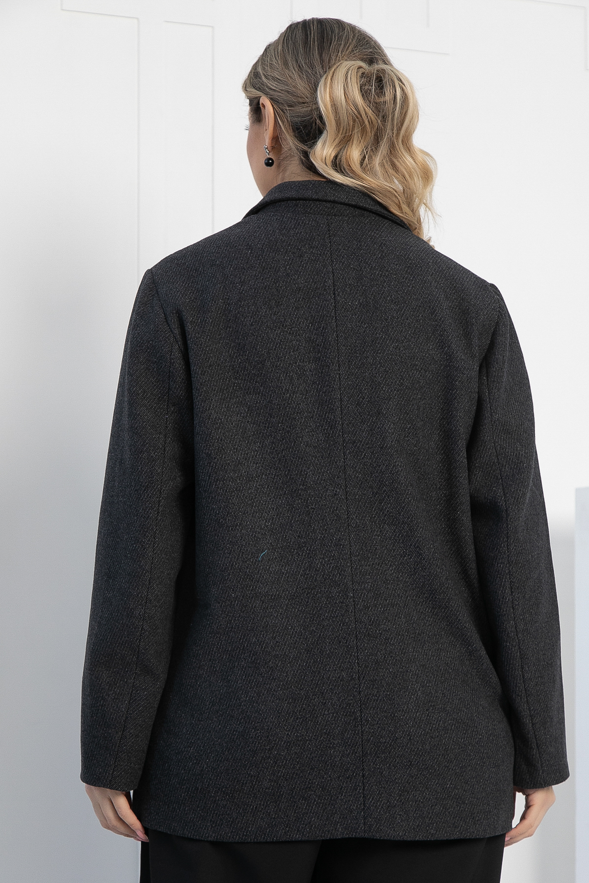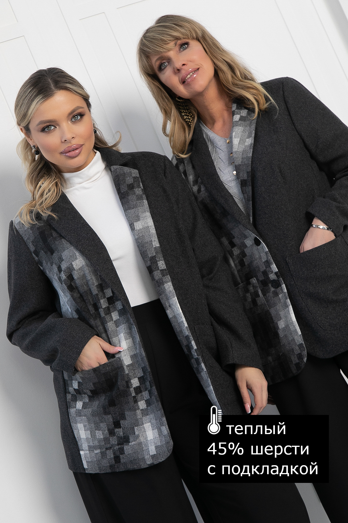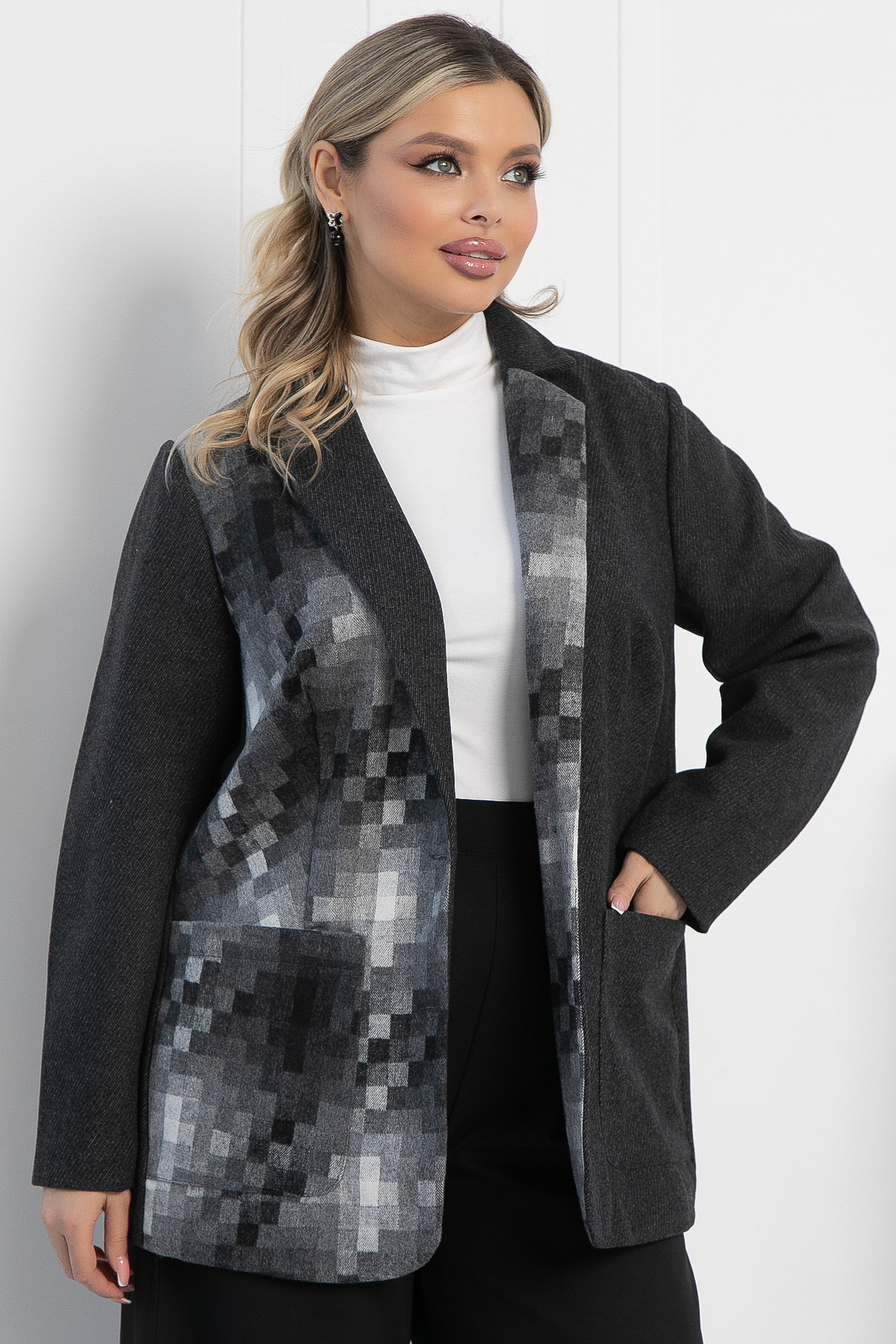 Элегантный пиджак в тёмно-сером цвете станет великолепным дополнением к вашему гардеробу, позволяя создавать как деловые, так и повседневные образы с легкостью и стилем! Он выполнен из плотной костюмной ткани с подкладкой, что обеспечивает комфорт. Длинные втачные рукава. Отложной воротник придает пиджаку классический и утонченный вид. Накладные карманы добавляют функциональности и практичности. Спереди пиджак имеет два дизайна: одна половина однотонная серая, а другая — с изысканным рисунком в виде квадратиков, которые переходят от светло-серого к тёмно-серому оттенку.