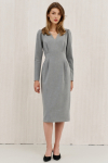 Платье лёгкое, струящееся на запахе. Отрезное по линии талии, расширенное к низу. Воротник выходящий из линии плеча, пиджачного типа, на участке воротника - декоративная перемычка создающая мягкую складку. Рукава одношевные с узкой резинкой по низу и сборкой по окату. Длина рукава до линии локтя. Застежка внешней части переда на потайную кнопку, внутренней части переда на завязку. В боковых швах карманы. Особенностью платья платья является обработка всех внутренних швов платья окантовкой, что придает изделию элитный вид.