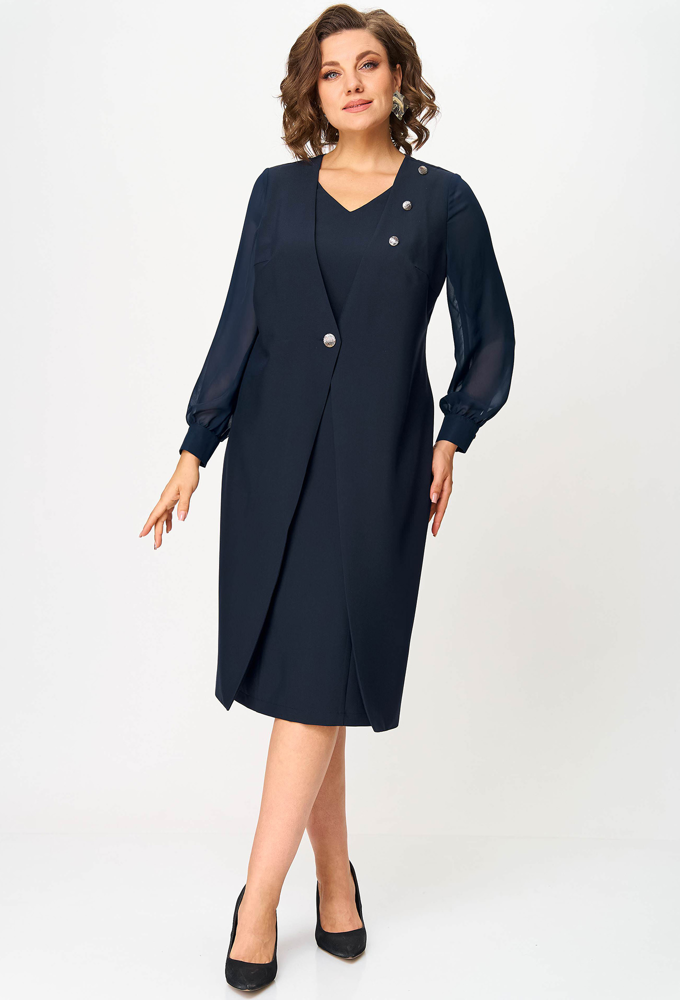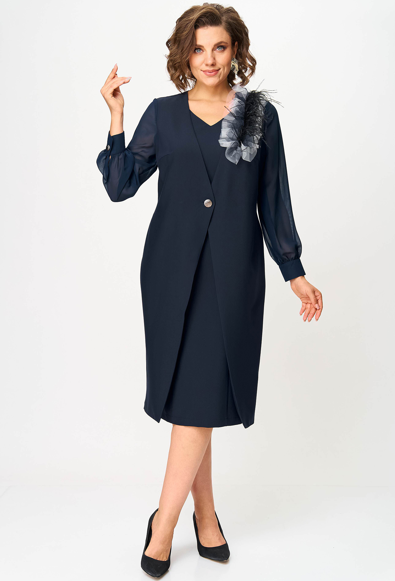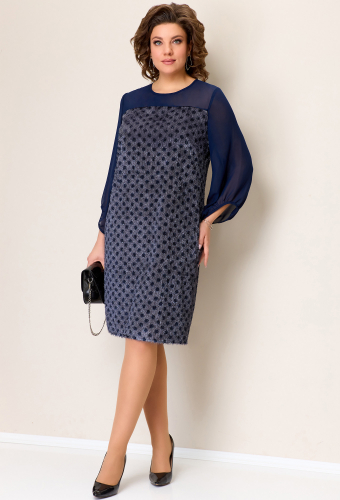 Полочка платья двухслойная. Нижняя полочка с вертикальными рельефами и горловиной V-образной формы. Верхняя полочка отлетная, с нагрудными вытачками, глубокой V-образной горловиной и застежкой в области талии на одну декоративную пуговицу. Спинка со средним швом и вертикальными рельефами, в верхней части среднего шва обработана потайная молния, в нижней части разрез. Рукав втачной, одношовный, длинный, выполнен из шифона. По низу рукав со сборкой и на притачной манжете, с застежкой на петлю и пуговицу.