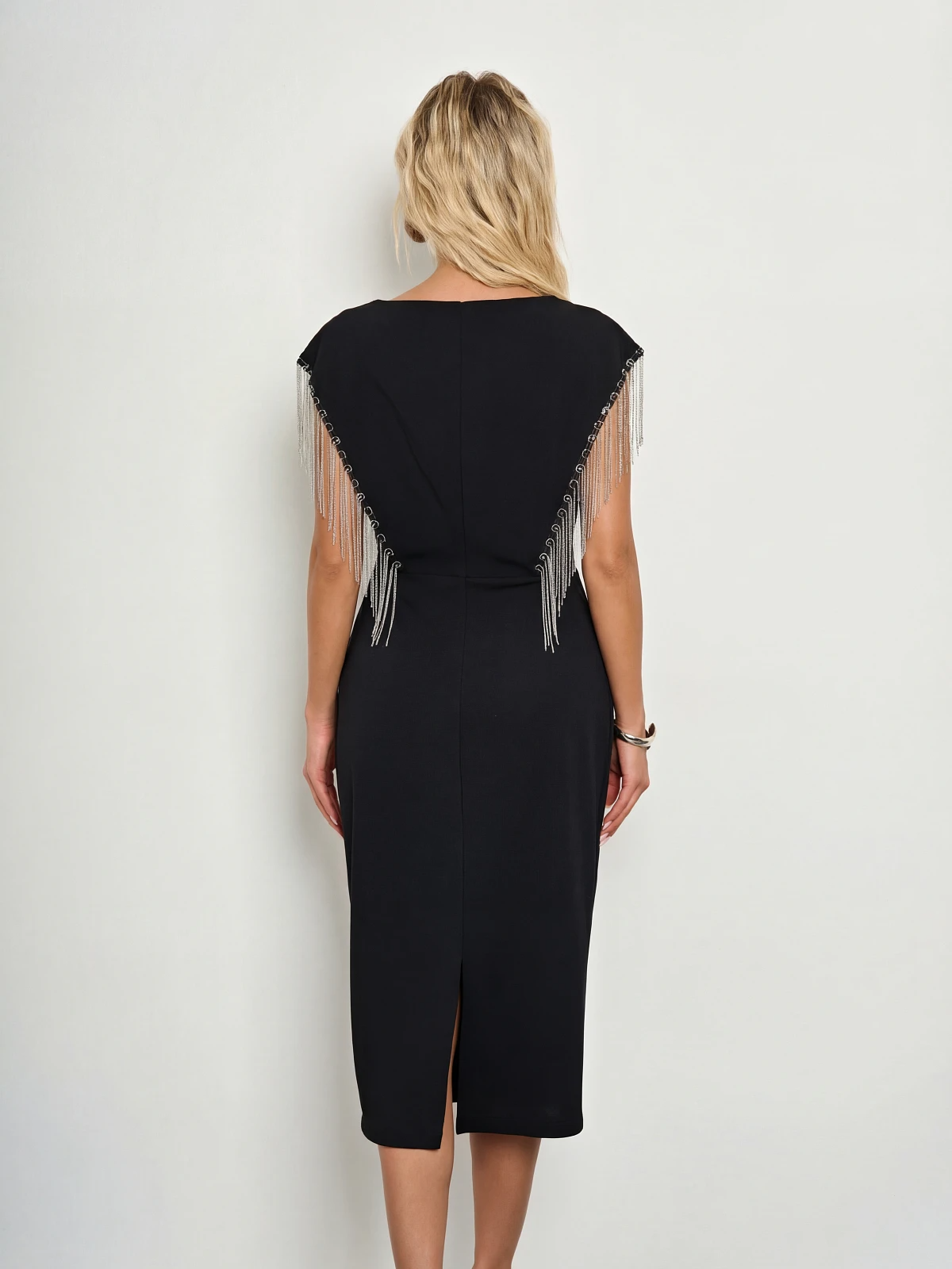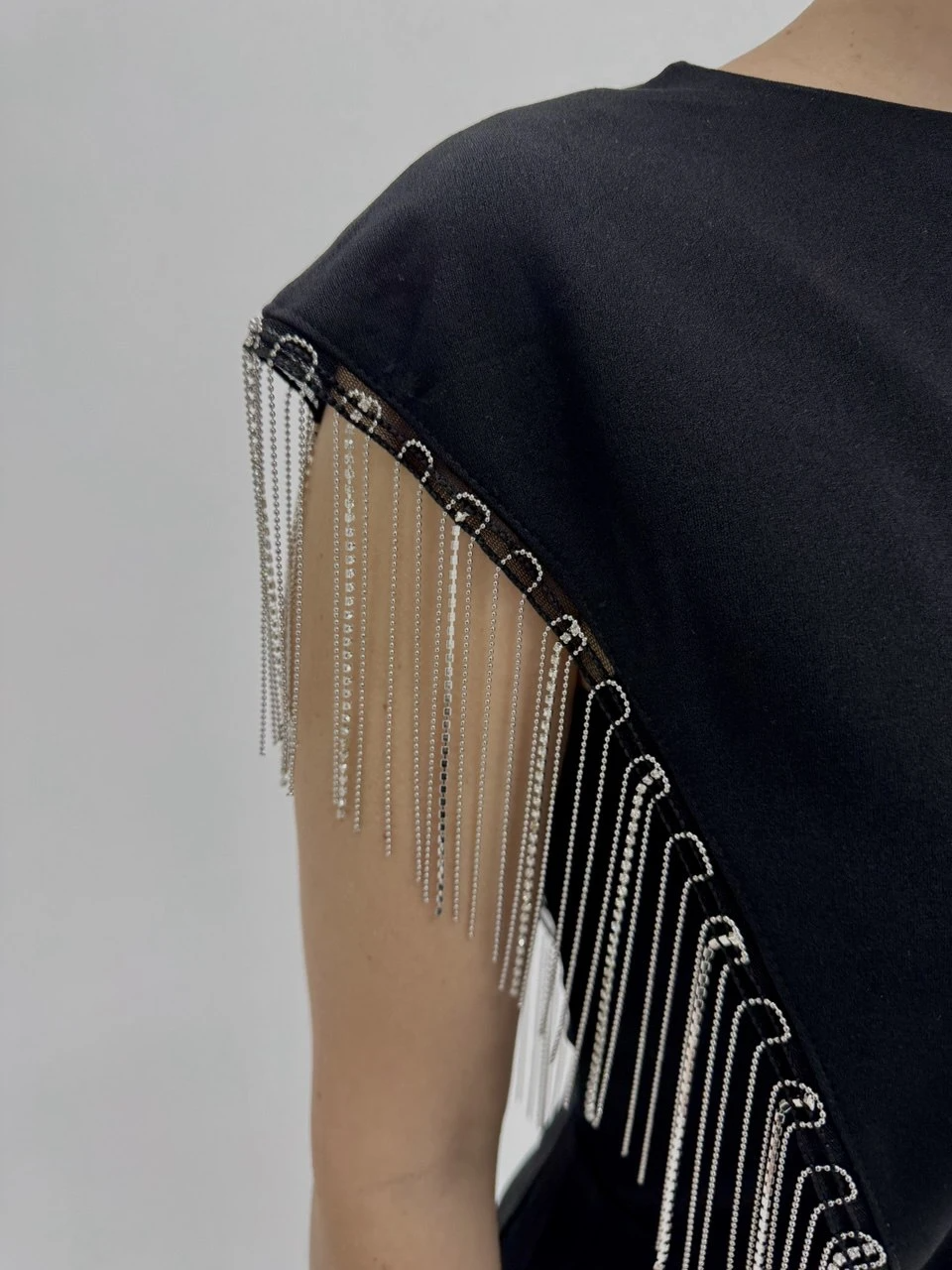Перед и спинка декорированы  металлической бахромой.