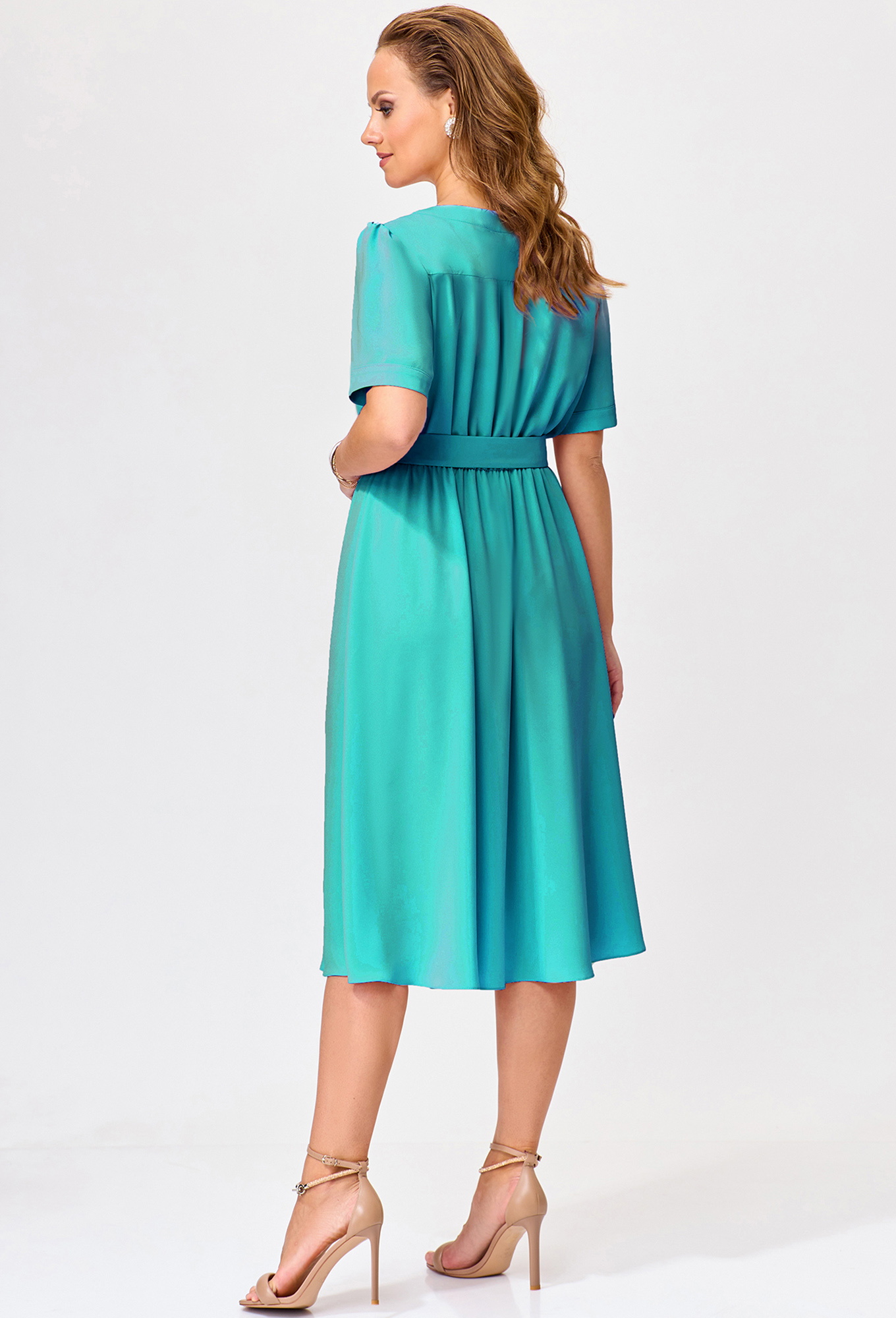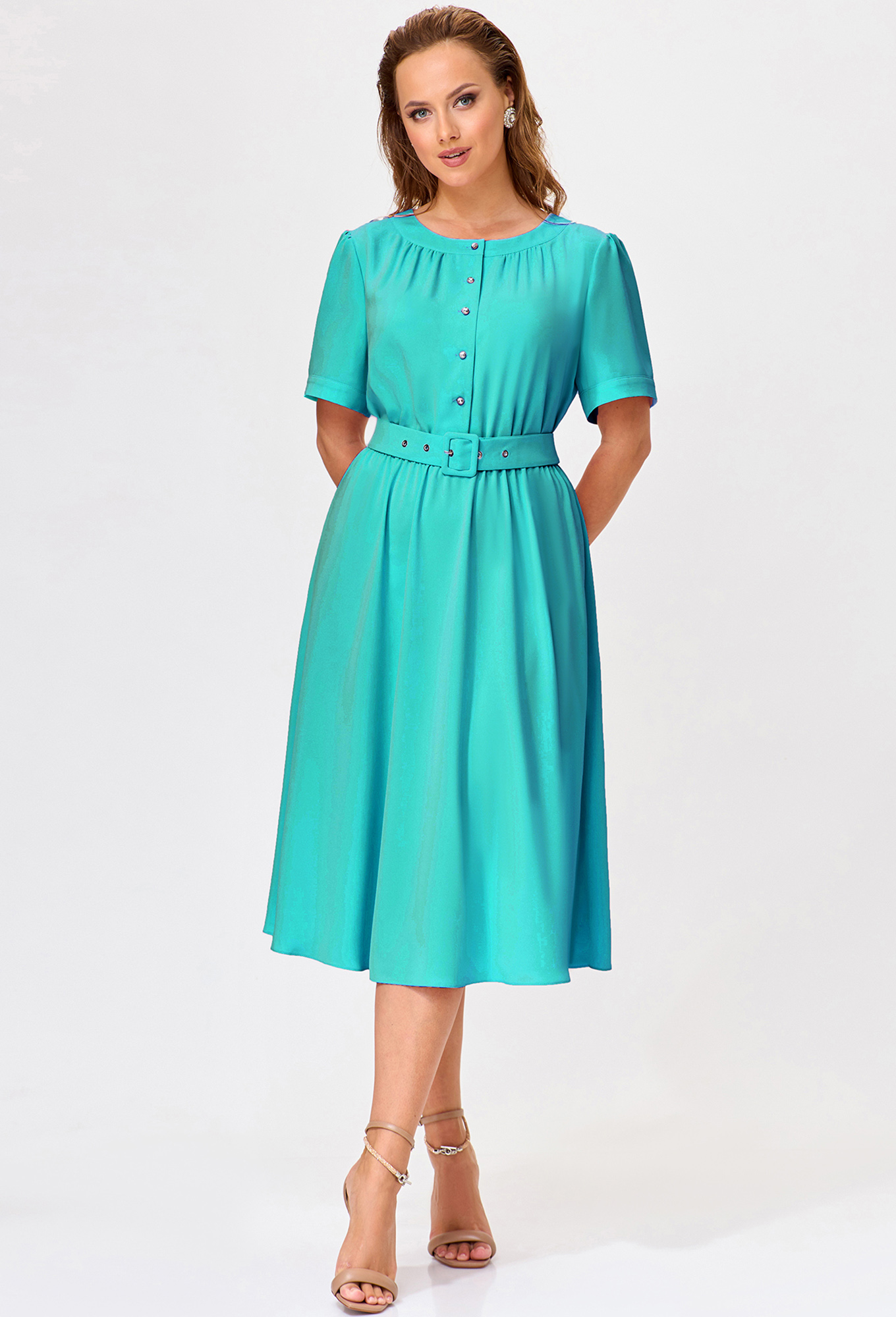 Модель: Базалини 4953 зелёный Рос..показатьт: 164 см (девушка на фото ростом 170см) Сезон: Весна-Лето Тип ткани: 55% полиэстер, 45% вискозаЭто платье Х-образного силуэта в равной степени является и элегантным и эффектным. Модель с отрезной линией талии на резинке крайне комфортна в носке и хорошо садится на разные типы фигур. Платье сшили из лёгкой приятной ткани, которая красиво развевается во время ходьбы. Модель с отделочными деталями по горловине дополнили сборкой и застёжкой с ювелирными пуговицами по переду, кокеткой со сборкой по спинке и втачными рукавами с притачными манжетами и сборкой по окату. Линия талии красиво подчёркивается поясом с пряжкой в тон.