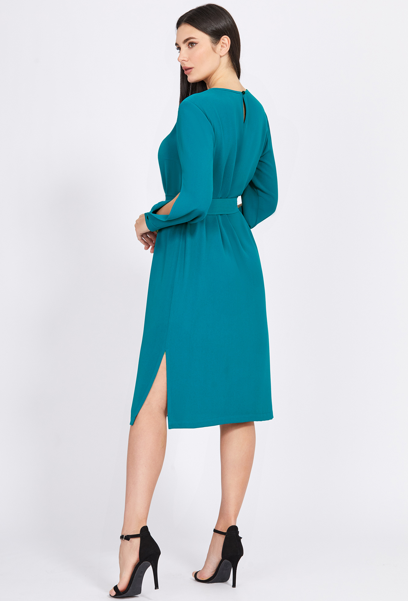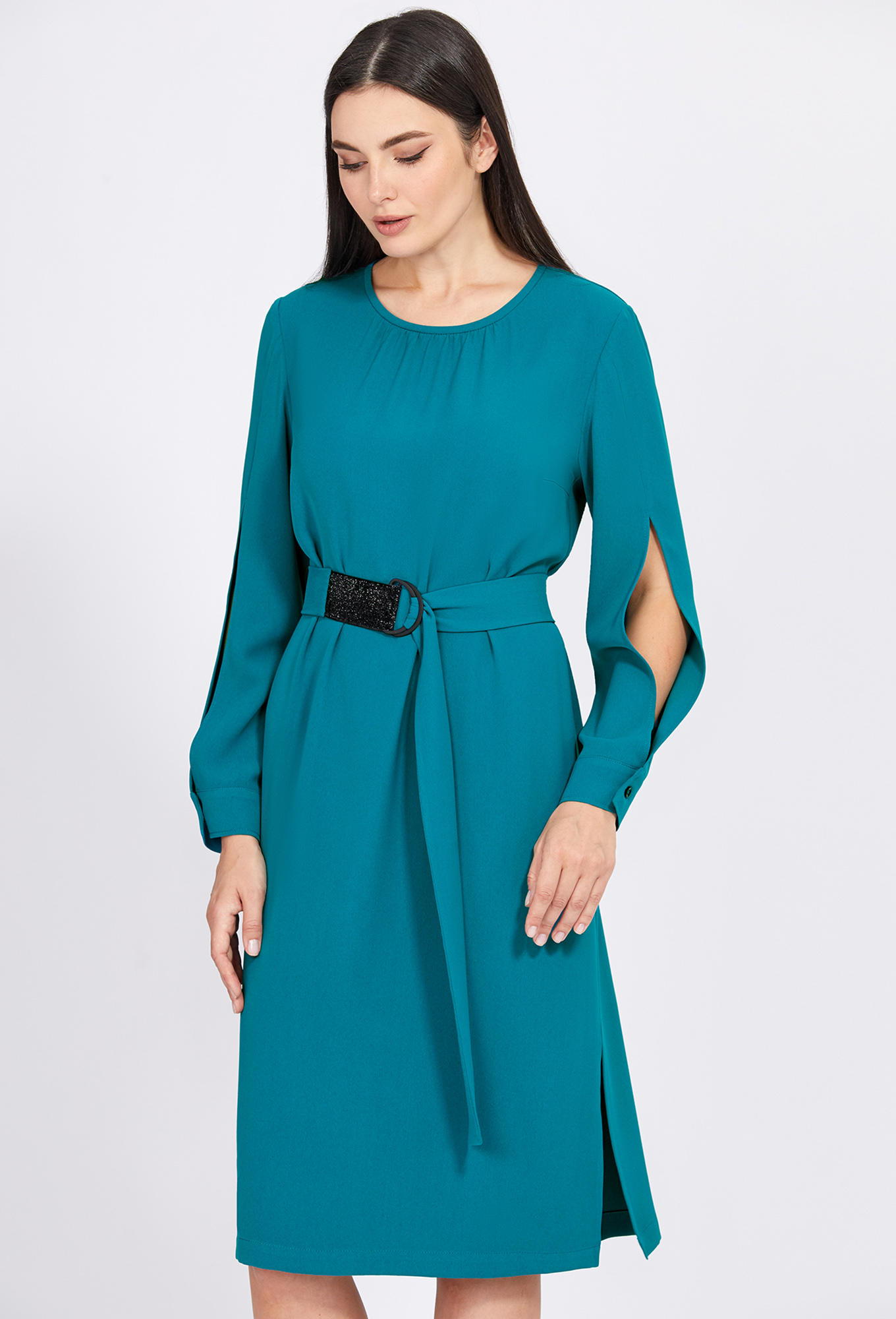 Модель: Базалини 4955 бирюза Рост..показать: 170 см (девушка на фото ростом 170см) Сезон: Круглогодичный Тип ткани: Полиэстер 100%Несмотря на лаконичный крой, это платье прямого силуэта длины миди не лишено своей индивидуальности благодаря интересному крою рукавов, разрезам в боковых швах, добавляющим нотку пикантности и сборке по горловине переда, создающей романтическое настроение, а завершает образ красивый пояс с D-пряжками с контрастной вставкой из мерцающей тесьмы. Модель выполнили из приятной, однотонной ткани и дополнили по спинке застёжкой на навесную петлю-пуговицу.
