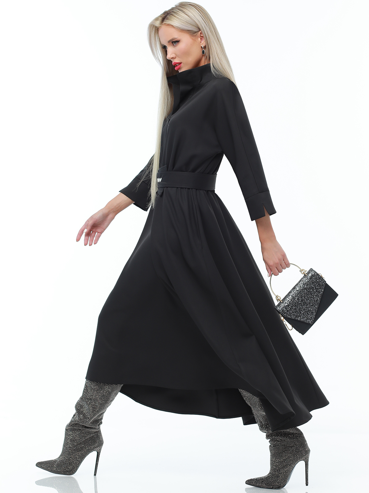 Эффектное платье миди с поясом — идеальный вариант для особого случая, благодаря которому вы точно окажетесь в центре внимания. Приталенная модель длиной ниже колена с асимметричной юбкой и рукавом ¾ смотрится элегантно, не сковывает движений и надежно скрывает нюансы в области бедер. Воротник можно носить как поднятым наподобие стойки, так и в виде отложного воротничка, чтобы создать V-образный вырез. В обоих случаях эта детально придает образу особый королевский шарм и выглядит оригинально. Широкий пояс с металлическими пуговицами стильно завершает модель. Платье выполнено из плотной, приятной к телу ткани, которая не просвечивает и практически не мнется. Чтобы изделие долго радовало вас красотой, рекомендуется стирать его в деликатном режиме при температуре до 30 градусов, не отжимать и сушить в расправленном виде.