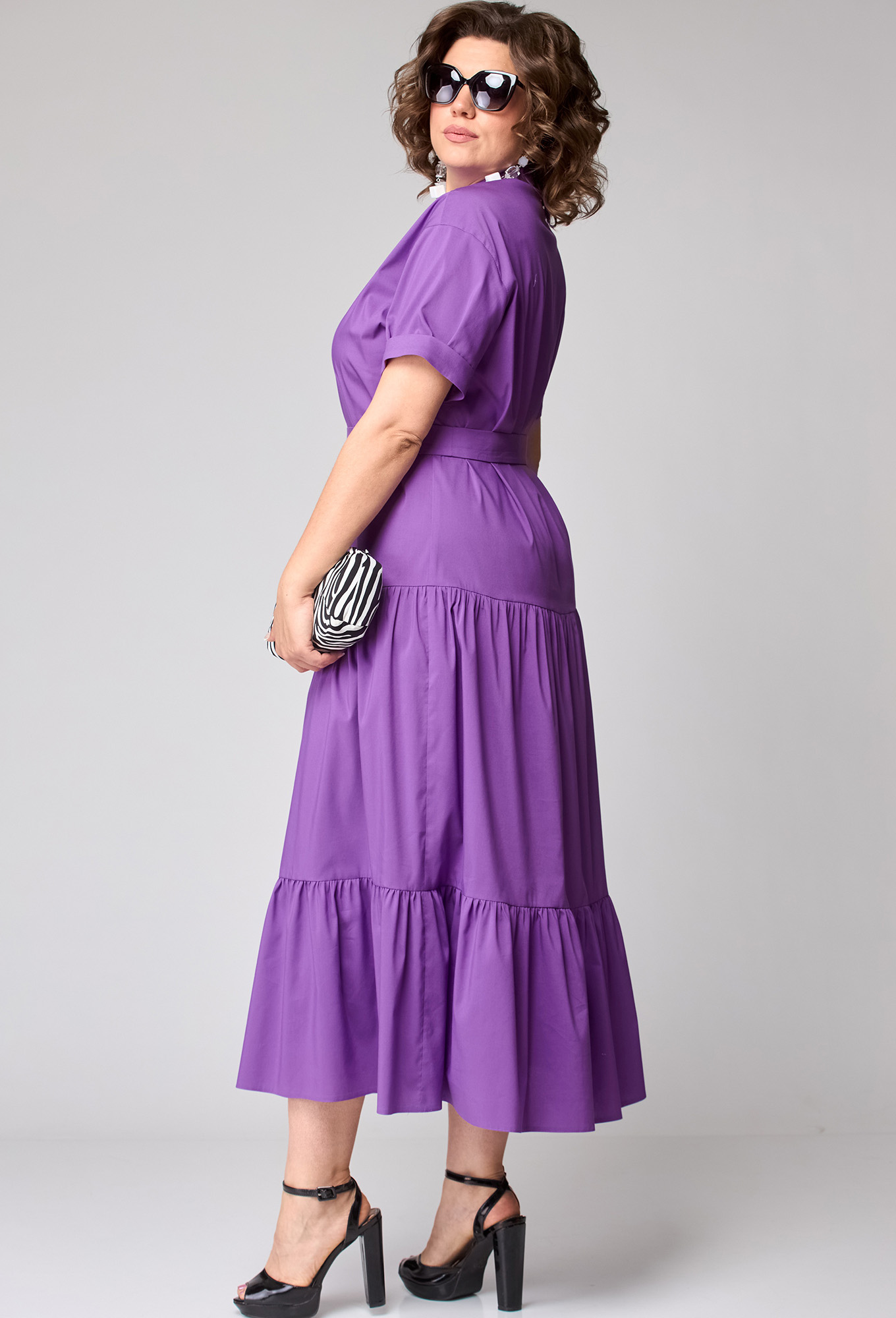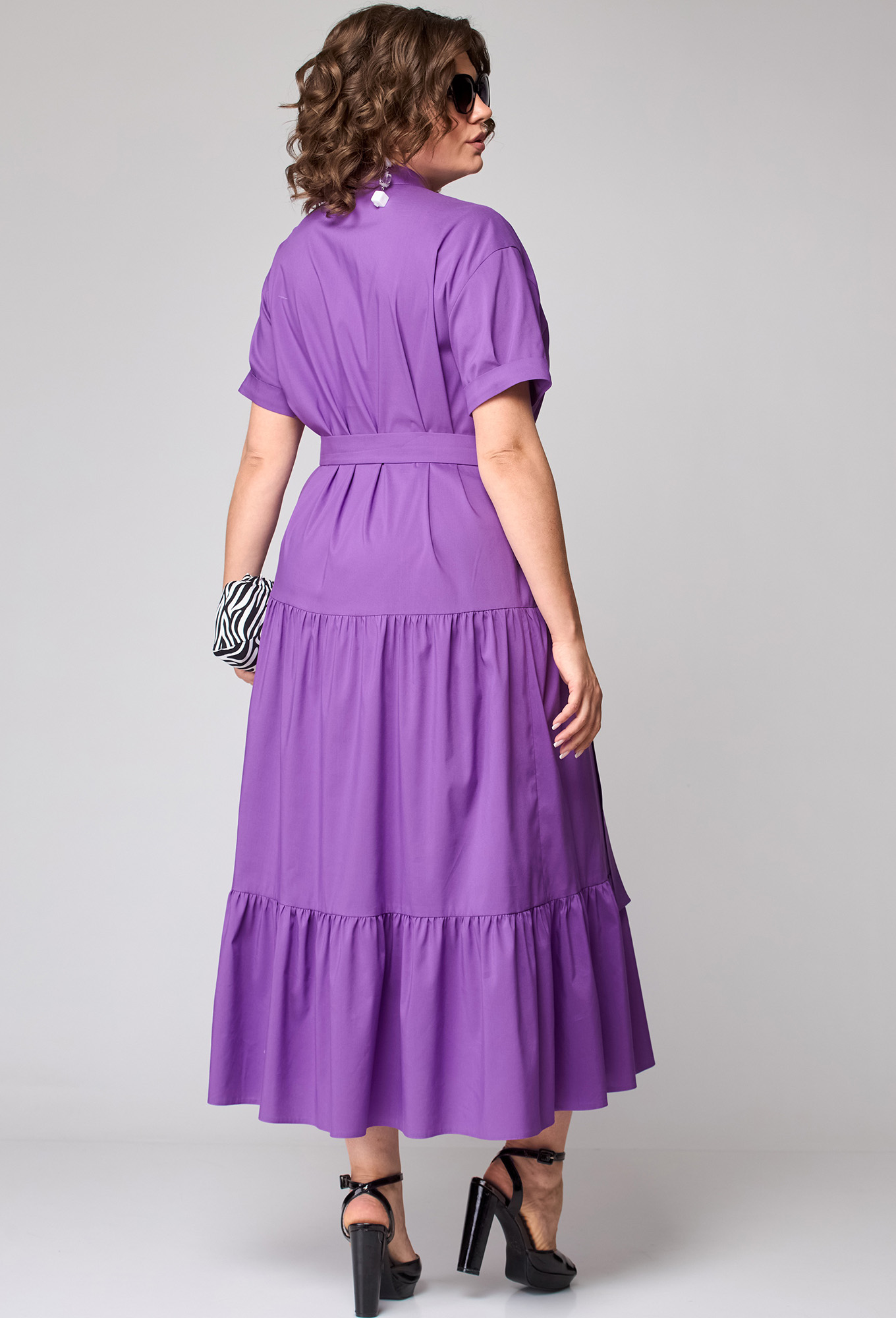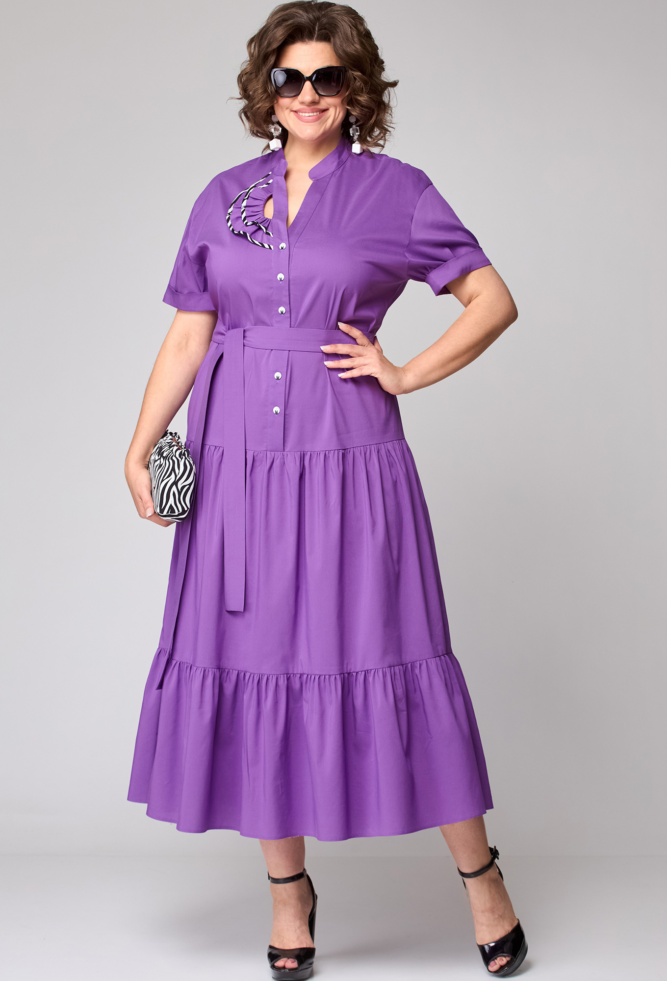 Модель: ЕВА ГРАНТ 7168 сирень Рос..показатьт: 170 см (девушка на фото ростом 170см) Сезон: Весна-Лето Тип ткани: Хлопок 71%, Полиамид 26%, Эластан 3%Платье женское нарядно-повседневное полуприлегающего силуэта расширенное к низу за счет воланов. Выполнено из хлопка в сочетании с отделкой. Вырез горловины V-образный со стойкой, застежка на петли и пуговицы до линии бедер. От бедер два притачных волана собранные на сборку. рукав тачной по низу с притачной манжетой заутюженной к верху. Декором служит отделочная деталь по вырезу горловины и съемный пояс из основной ткани.