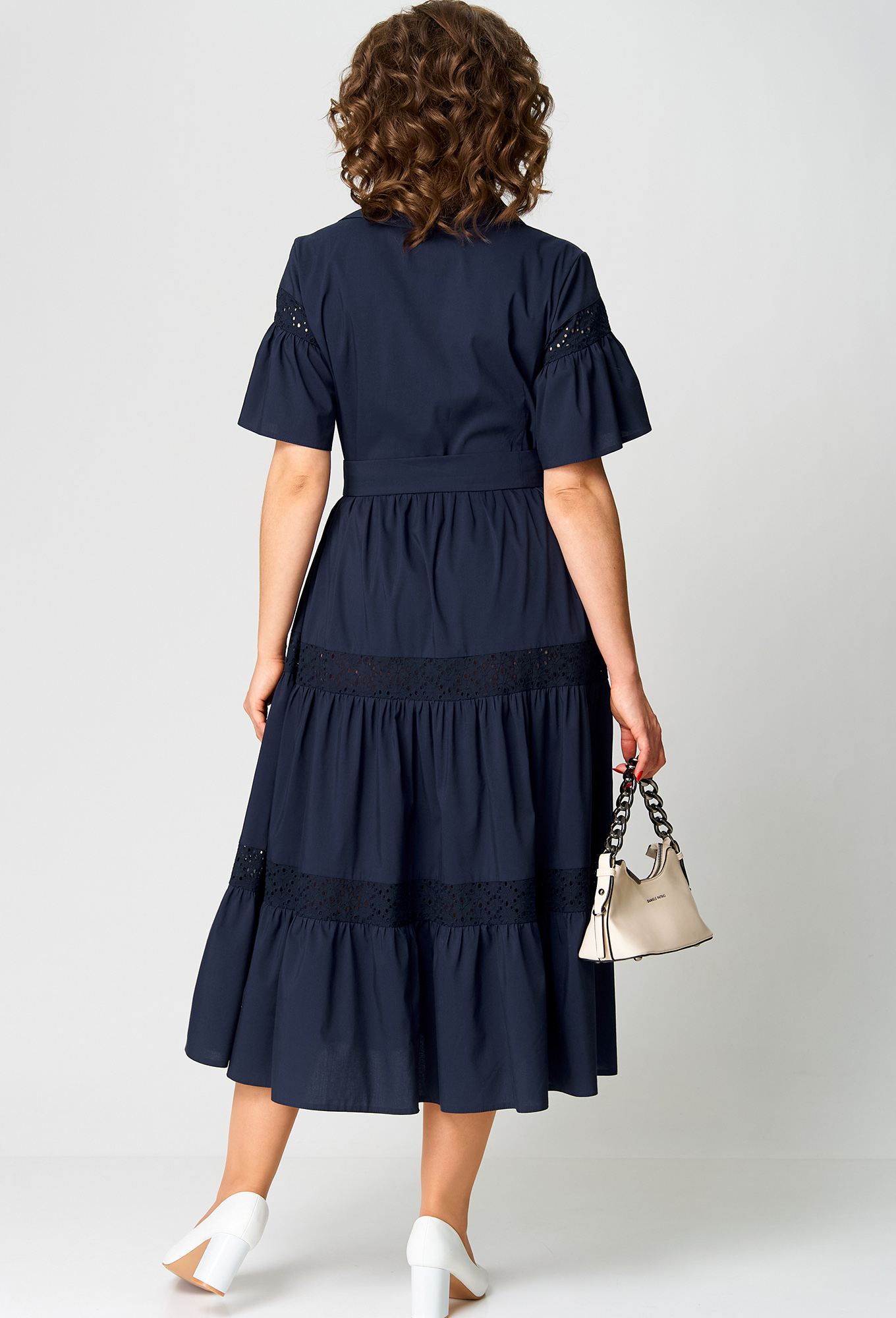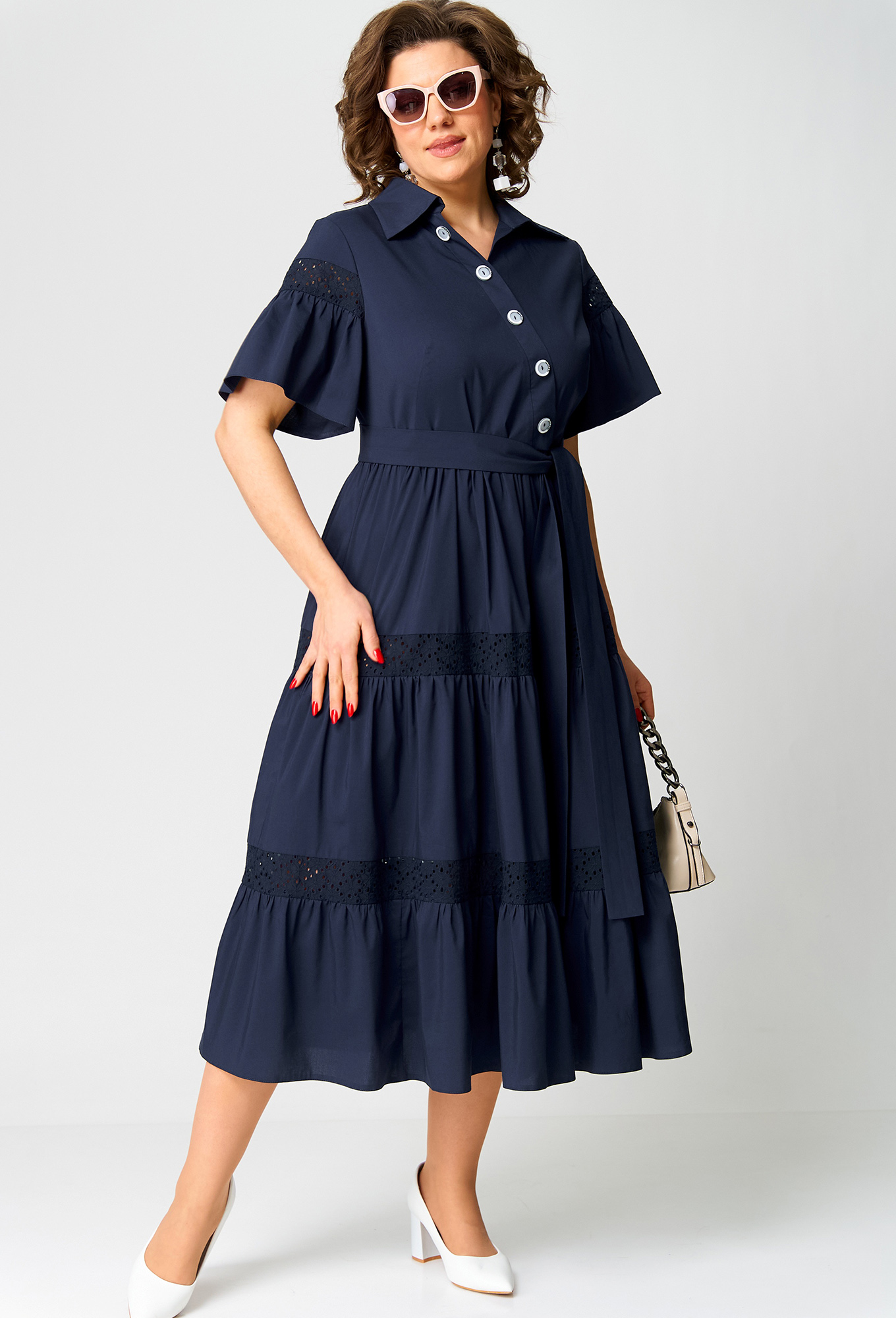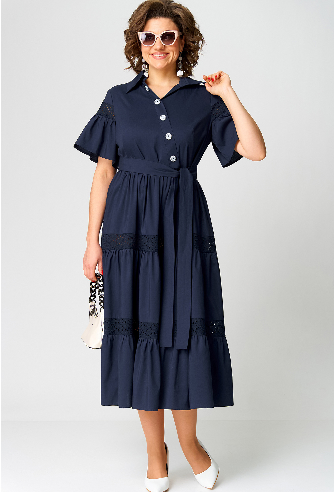 Модель: ЕВА ГРАНТ 7181Е синий Рос..показатьт: 170 см (девушка на фото ростом 170см) Сезон: Весна-Лето Тип ткани: Хлопок 71%, полиамид 26%, эластан 3%Платье женское нарядно-повседневное полуприлегающего силуэта до талии расширенное к низу. Выполнено из хлопка в сочетании с отделкой из хлопкового шитья. Вырез горловины фигурный, по полочке нагрудные вытачки и вставка по талии из шитья рукав "крылышко" по краям зафиксирован сантиметровой резинкой. В боковых швах обработаны карманы, по низу платья притачной волан. По центру переда платья застежка - планка на обметанные петли и пуговицы до нижнего волана.Декором платья служат элементы из отделочной ткани (шитья) и рюша с окантовкой по центру переда.т: 170 см (девушка на фото ростом 170см)