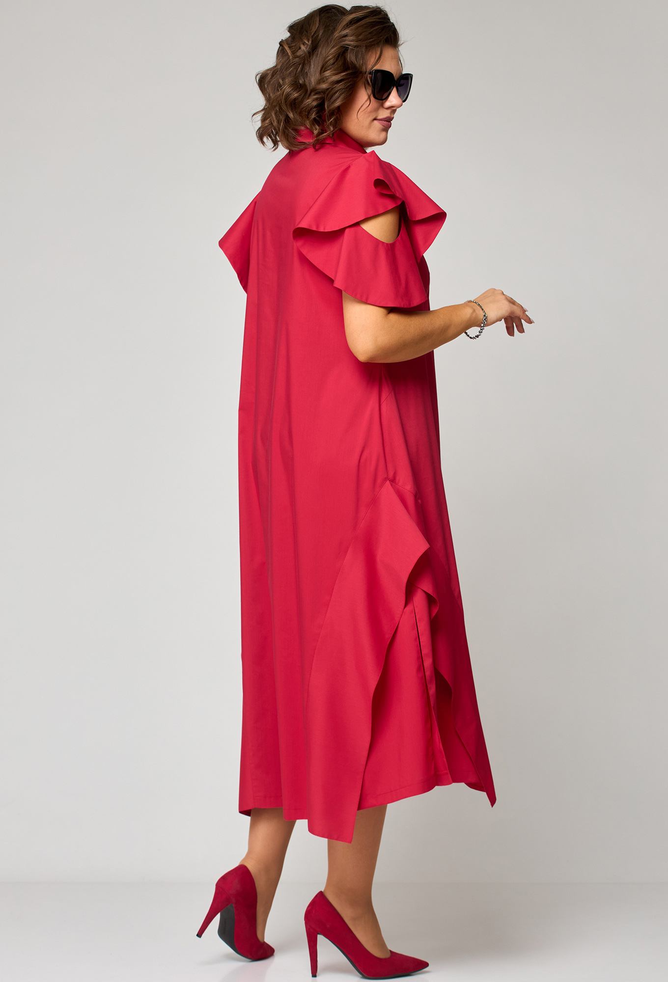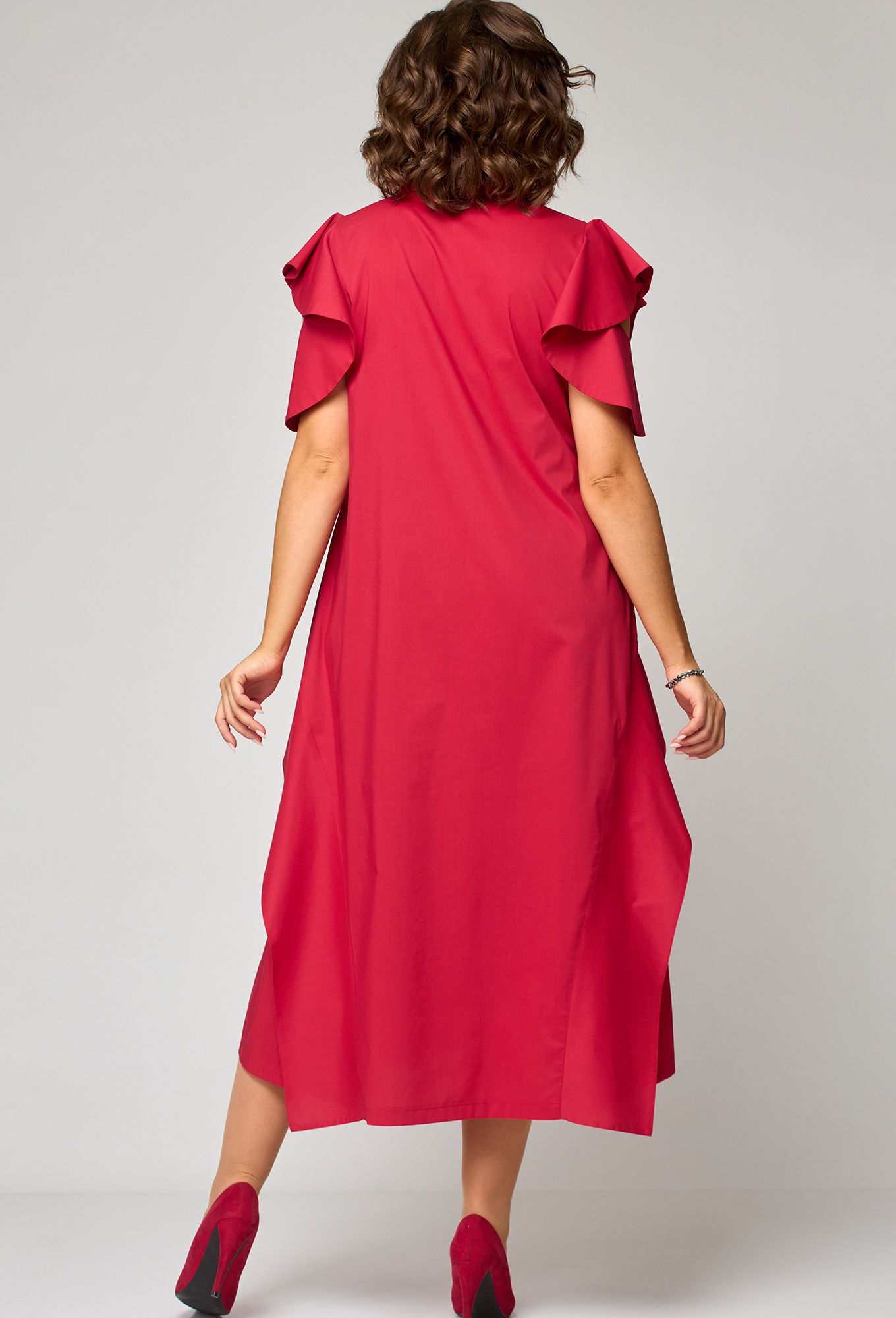 Модель: ЕВА ГРАНТ 7297-1 красный ..показатьРост: 170 см (девушка на фото ростом 170см) Сезон: Весна-Лето Тип ткани: Хлопок 71%, Полиамид 26%, Эластан 3%Платье женское нарядно-повседневное полуприлегающего силуэта расширенное к низу с ассиметричными воланами по боковым швам. Вырез горловины воротник на стойке рубашечного типа по центру с отделочным элементом и навесной петлей и пуговицей. Рукав втачной "Фэнтези" в виде крылышка частично с открытым плеом. В боковых швах обработаны карманы разрезы. Декором платья служит пуговица отделочная со стразами и фигурные воланы по низу и боковым платья.Рост: 170 см (девушка на фото ростом 170см)