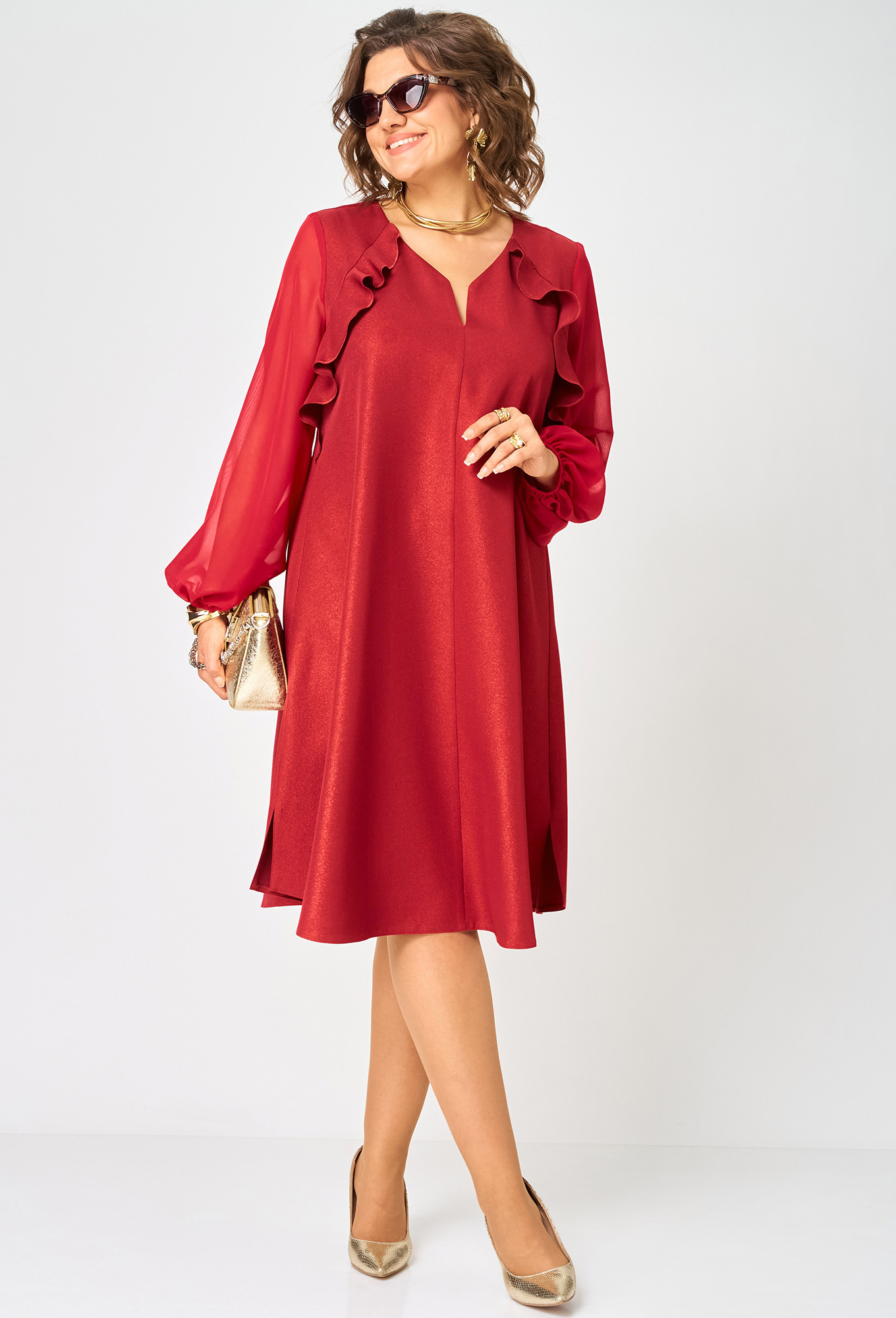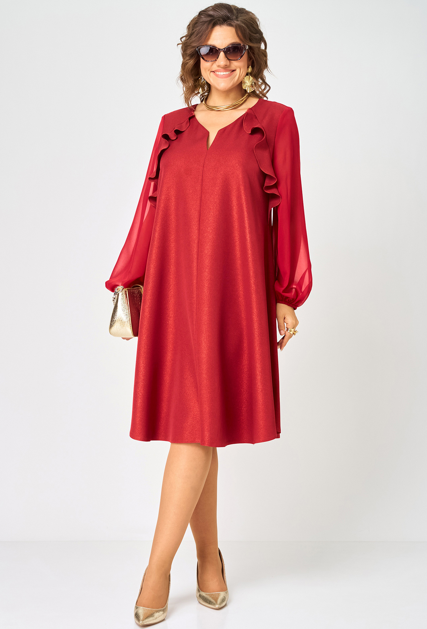 Модель: ЕВА ГРАНТ 7322А красный Р..показатьост: 170 см (девушка на фото ростом 170см) Сезон: Круглогодичный Тип ткани: полиэстер 74%, вискоза 21%, спандекс 5%Платье красивое нарядное женское шикарное А-образного силуэта расширенное к низу выполнено из плательной ткани пропитанной блестками (не осыпаются) в сочетании с шифоном. Вырез горловины фигурный на обтачке, рукав втачной из шифона по низу на резинке. По полочке кокетки с притачным воланом входящим в боковой шов. В боковых швах обработаны небольшие разрезы.ост: 170 см (девушка на фото ростом 170см)