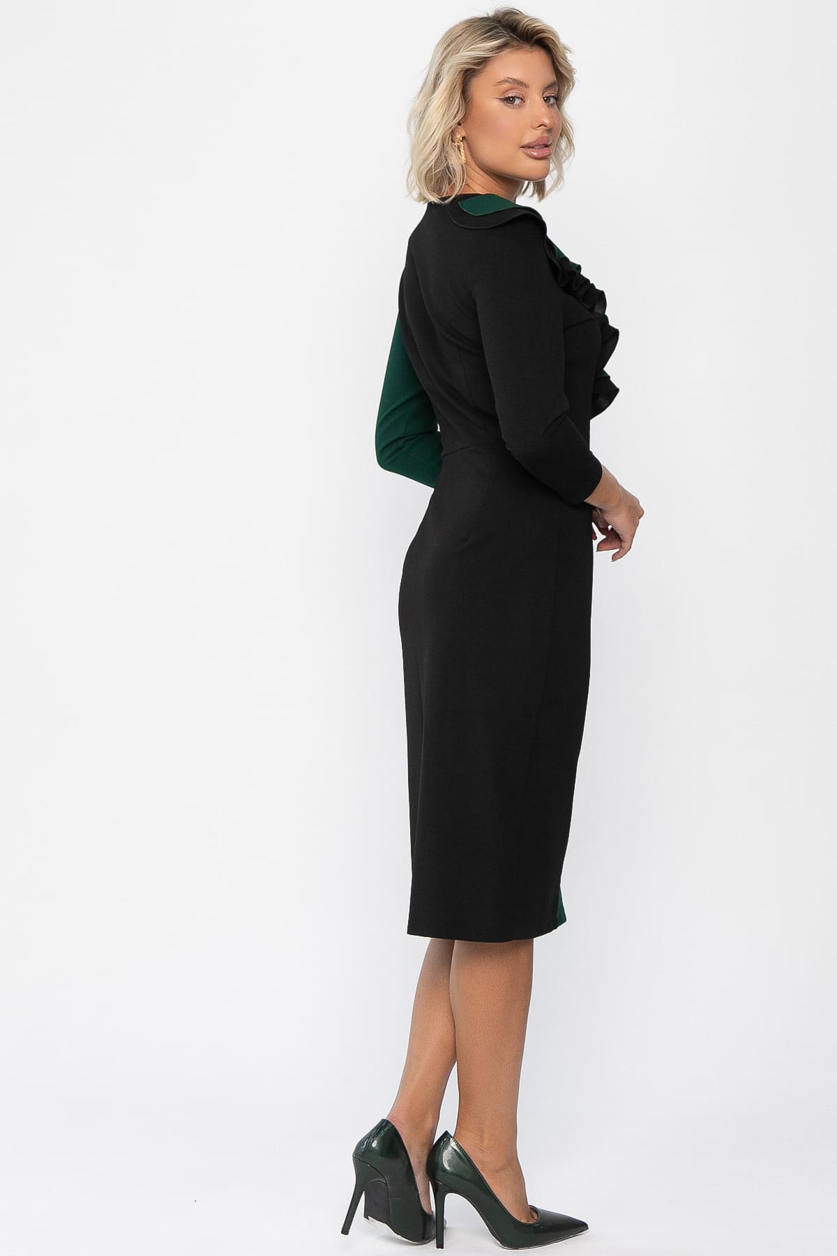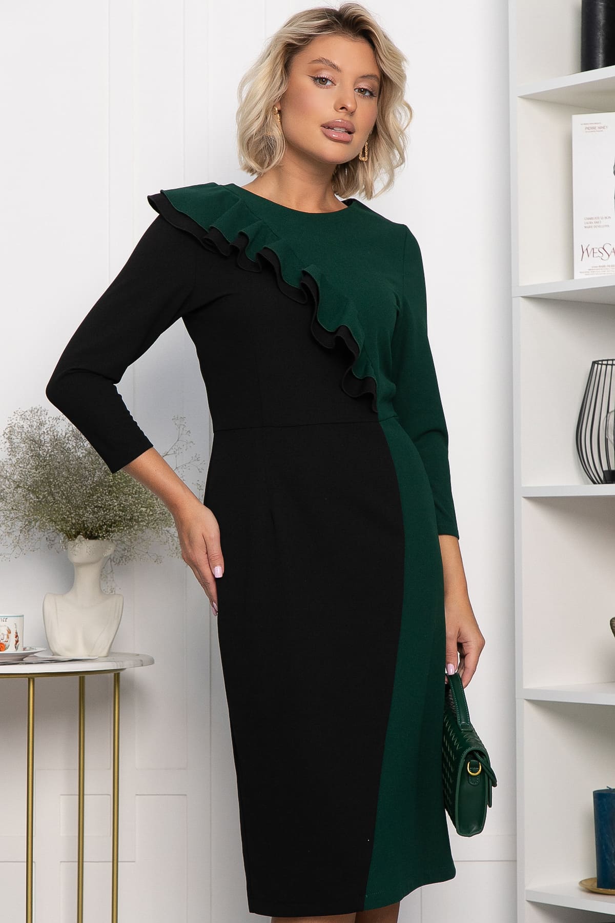 Роскошное платье, спереди комбинированное из двух цветов создающая свою уникальность, за счет двойного волана на лифе. Модель имеет рукава 3/4 и может стать достойным повседневным нарядом на осень и зиму для девушек, любящих выглядеть элегантно в любой ситуации – на вечеринке и на работе.