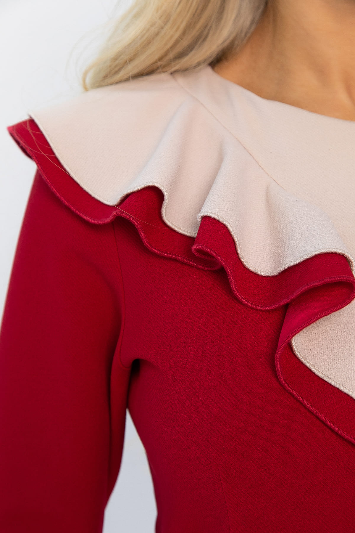 Роскошное платье, спереди комбинированное из двух цветов создающая свою уникальность, за счет двойного волана на лифе. Модель имеет рукава 3/4 и может стать достойным повседневным нарядом на осень и зиму для девушек, любящих выглядеть элегантно в любой ситуации – на вечеринке и на работе.