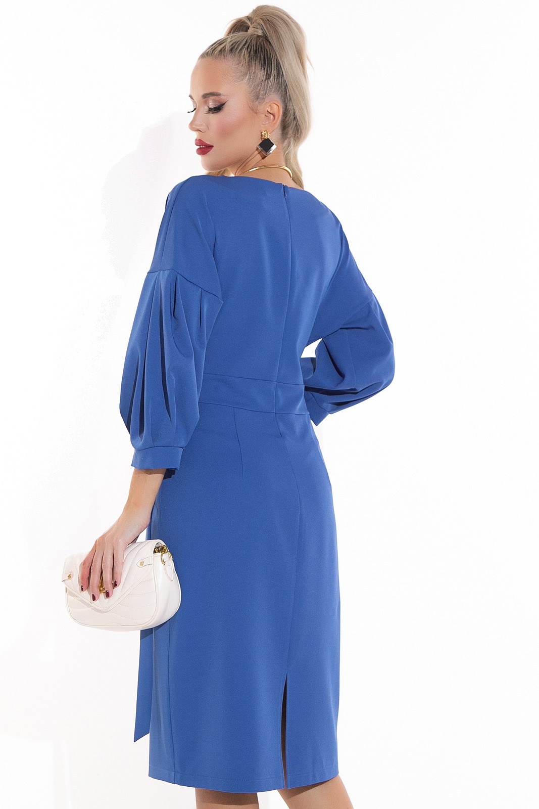 Модель приталенного силуэта из плательной ткани с v-образным вырезом на груди. Актуальное сочетание объемных рукавов и облегающего силуэта отражают последние тенденции моды. Идеально подойдет для типа фигуры “песочные часы”. По спинке замок. Пояс втачен в боковые швы на уровне талии. Рекомендуем заказывать в размер. Вы будете настоящей звездой любого торжества.
