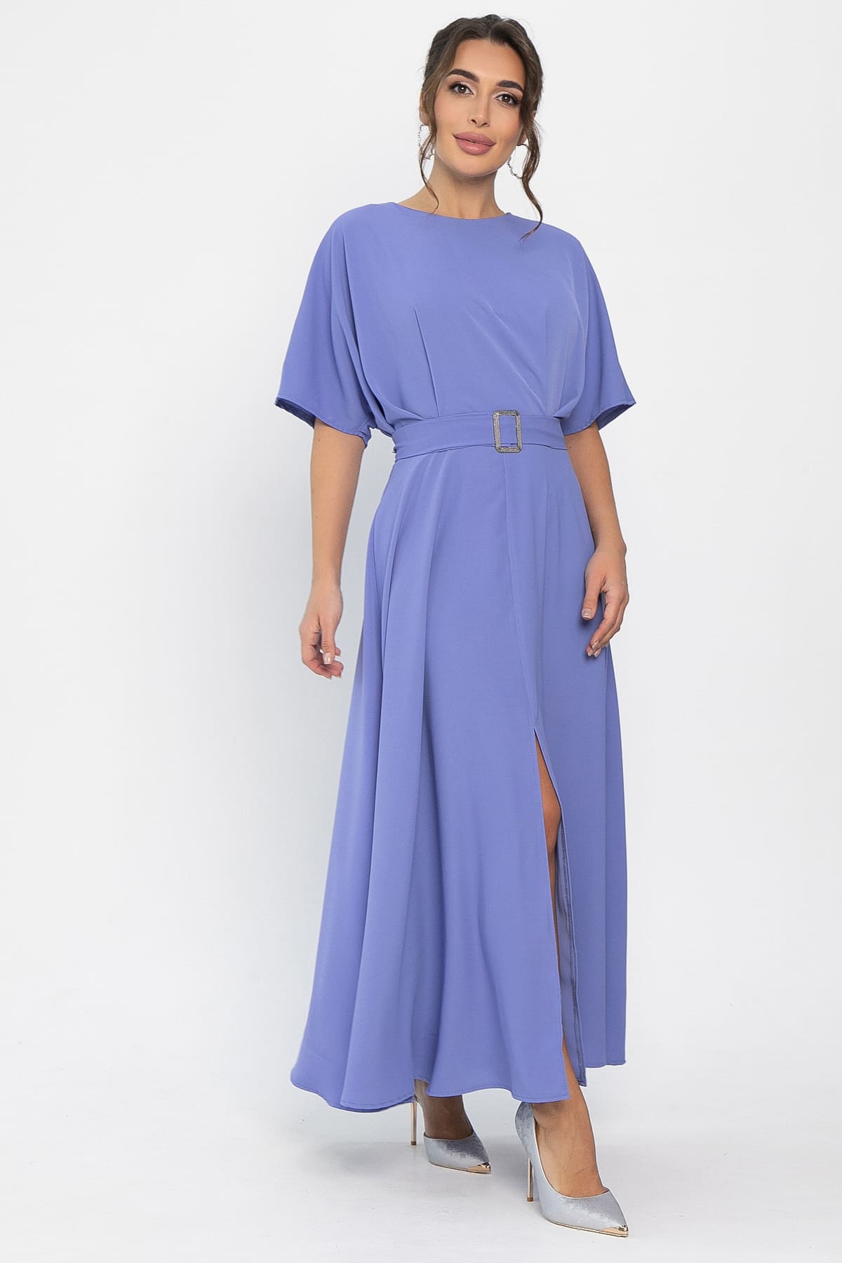 Элегантное платье в сиреневом цвете — настоящая находка для тех, кто ценит красоту линий и безупречный стиль. На спине расположена молния, которая облегчает процесс надевания. Платье имеет отрезную талию и две вертикальные складки, которые выполняют функцию вытачек, создавая изящный силуэт. Юбка длиной макси имеет форму расклешённой трапеции с эффектным разрезом спереди, что придаёт движениям динамичность и лёгкость. Пояс из основной ткани с металлической пряжкой, который входит в комплект, подчёркивает талию и завершает образ, придавая ему утончённости и стиля. Это платье — идеальный выбор для особых случаев и вечерних выходов.