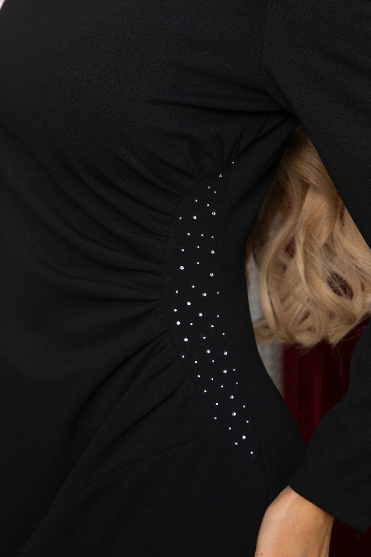 Роскошное платье полуприлегающего силуэта, которое станет настоящим украшением вашего вечернего или торжественного образа! Сочетание элегантных линий, продуманных деталей и декора делает эту модель по-настоящему особенной. Один бок платья изящно украшен мерцающими стразами, которые добавляют образу шарма. V-образная горловина, обработанная обтачкой, выгодно подчеркивает линию шеи и декольте, придавая образу утонченность и женственность. Спинка со средним швом и потайной молнией. Рукава втачные, длинный до запястья, с молнией снизу рукава и до локтя. Длина платья до середины икр. Молния спереди.