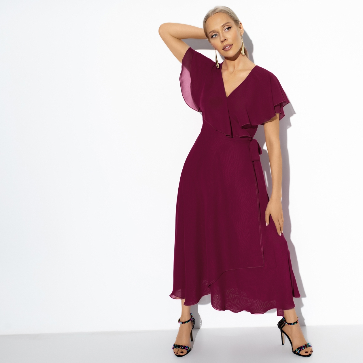Высокий пульс, легкое головокружение и периодическое заикание было диагностировано у него после свидания с вами. Виной всему платье в насыщенном винном цвете. Но он позвал вас на второе. Платье приталенное на запах. Подойдет на любой тип фигуры.