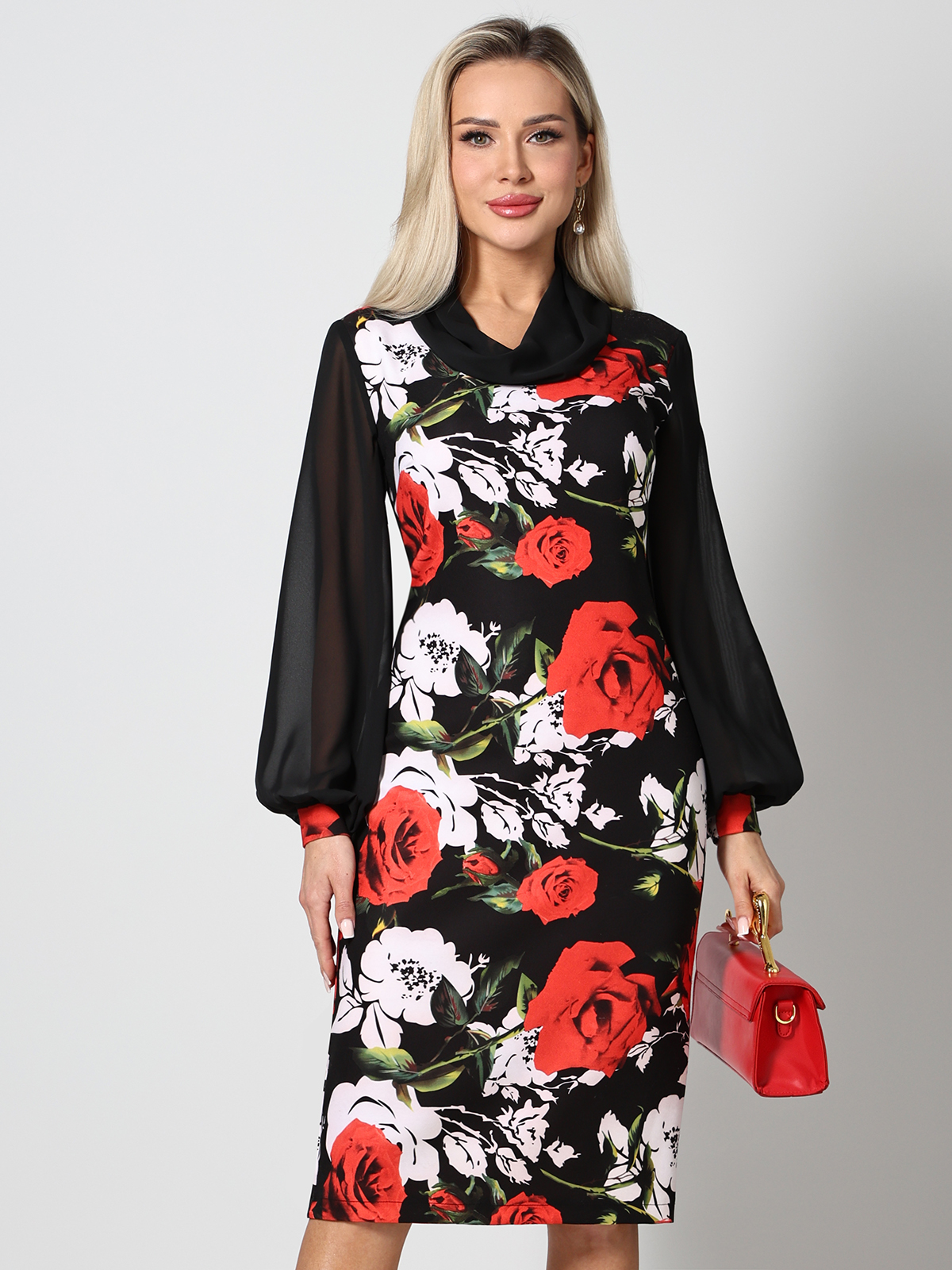 Классический полуприлегающий силуэт с минимумом швов — всегда выигрышная тема. Но в этот раз футляр декорирован шифоновым воротником-хомутом и шифоновыми же рукавами, что придает образу нарядность.