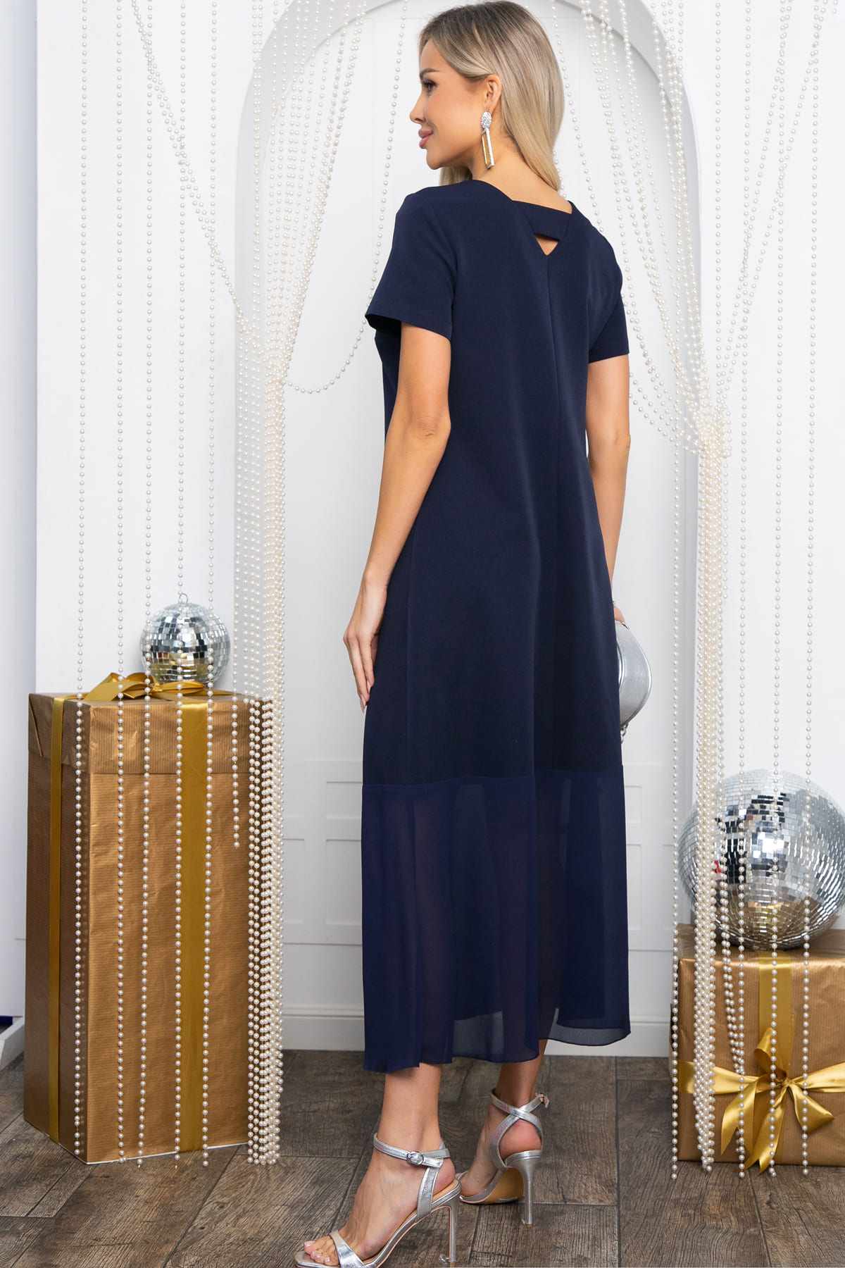 Нарядное платье из костюмной ткани синего цвета — идеальный выбор для особых случаев. Его длина макси и шифон по низу придают образу элегантность и уникальность. Короткие рукава подчеркивают стильный силуэт, а однотонный дизайн позволяет легко комбинировать платье с разными аксессуарами для создания разнообразных образов. Это универсальное и элегантное платье станет отличным выбором для торжественных мероприятий и праздников.