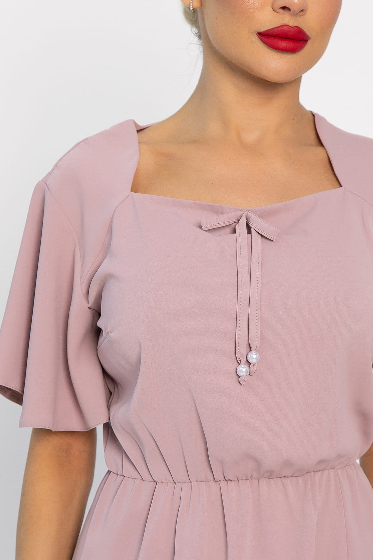 Платье из струящейся ткани в пудровом цвете приталенного силуэта. Кареобразный вырез изящно подчеркивает линию декольте. Юбка клешенная с двумя разрезами спереди. В таком платье вы точно будете в центре внимания. Оно достаточно сдержанно, но в то же время наполнено акцентными деталями, что идеально подчеркнет вашу красоту. Изделие имеет декоративный бантик с жемчугом. По талии на резинке.