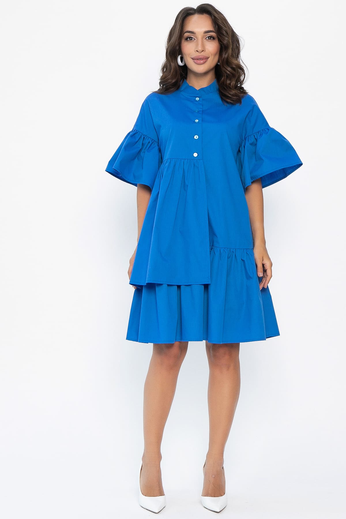 Ассиметричное воздушное платье в светло-лиловом цвете свободного силуэта. На правой полочке и левой половинке спинки – подрез, расположенный выше линии талии. В шов подреза вставлена декоративная отлетная оборка, переходящая с полочки на спинку. По полочке — центральная бортовая застежка на петли и пуговицы. Воротник – стойка. Линия плеча спущена. К пройме пришита широкая воздушная оборка. По низу платья по кругу проходит воздушная широкая оборка.