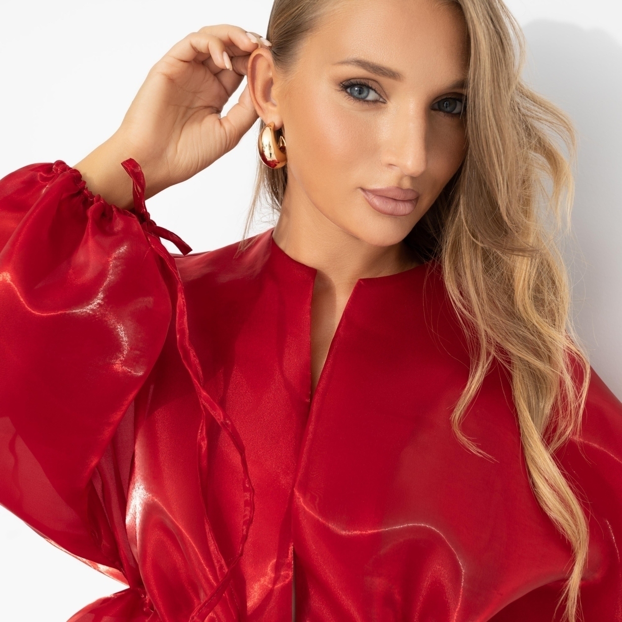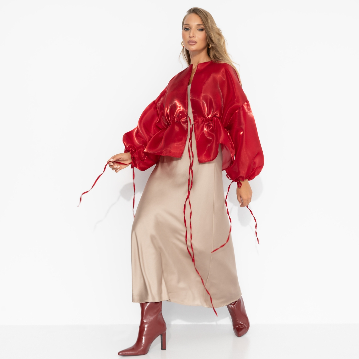 Жакет ЧАРУТТИ мгновенно приковывает внимание смелым цветом, символизирующим силу и страсть. Объемные рукава создают мощный и выразительный силуэт, подчеркивающий индивидуальность. Жакет создан для уверенных в себе женщин, которые гордо несут свою уникальность. Жакет объемного кроя. Есть регулируемая кулиска на талии. Линия плеча спущена. Есть шнуровка по манжетам. Материал изделия слегка просвечивает.