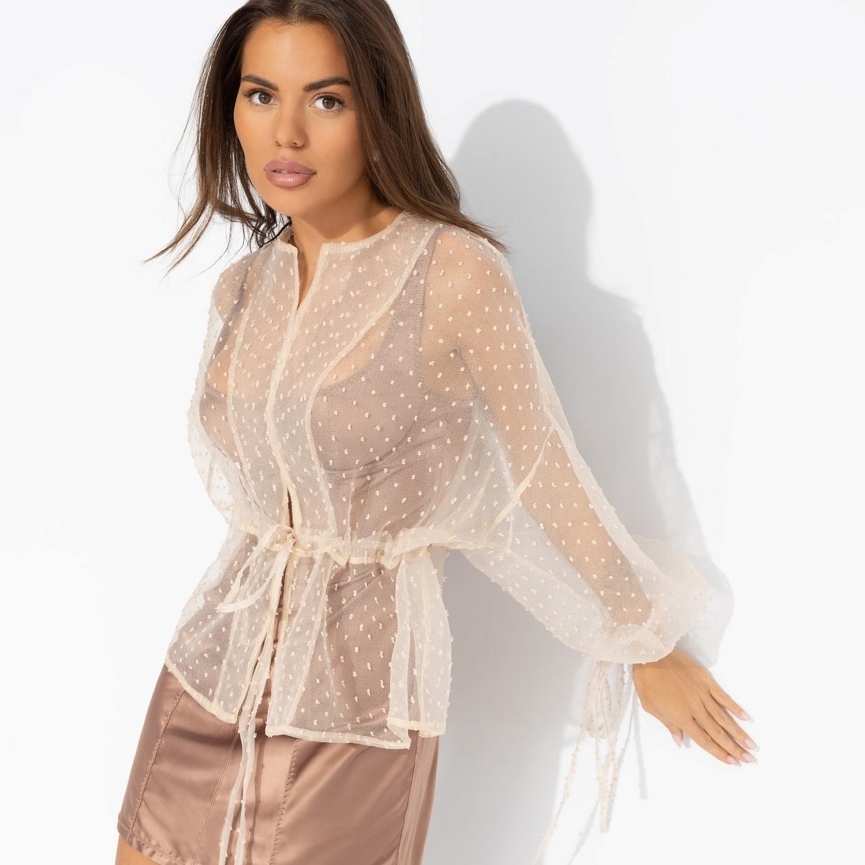 Воздушный жакет из органзы с горошком — это лёгкий поцелуй, нежный и трогательный. Молочный оттенок дарит чистоту, а игривые точки добавляют кокетства. Он создан для тех, кто умеет быть одновременно хрупкой и уверенной. Жакет на завязках. Линия плеча спущена. Посадка свободная. Изделие просвечивает.