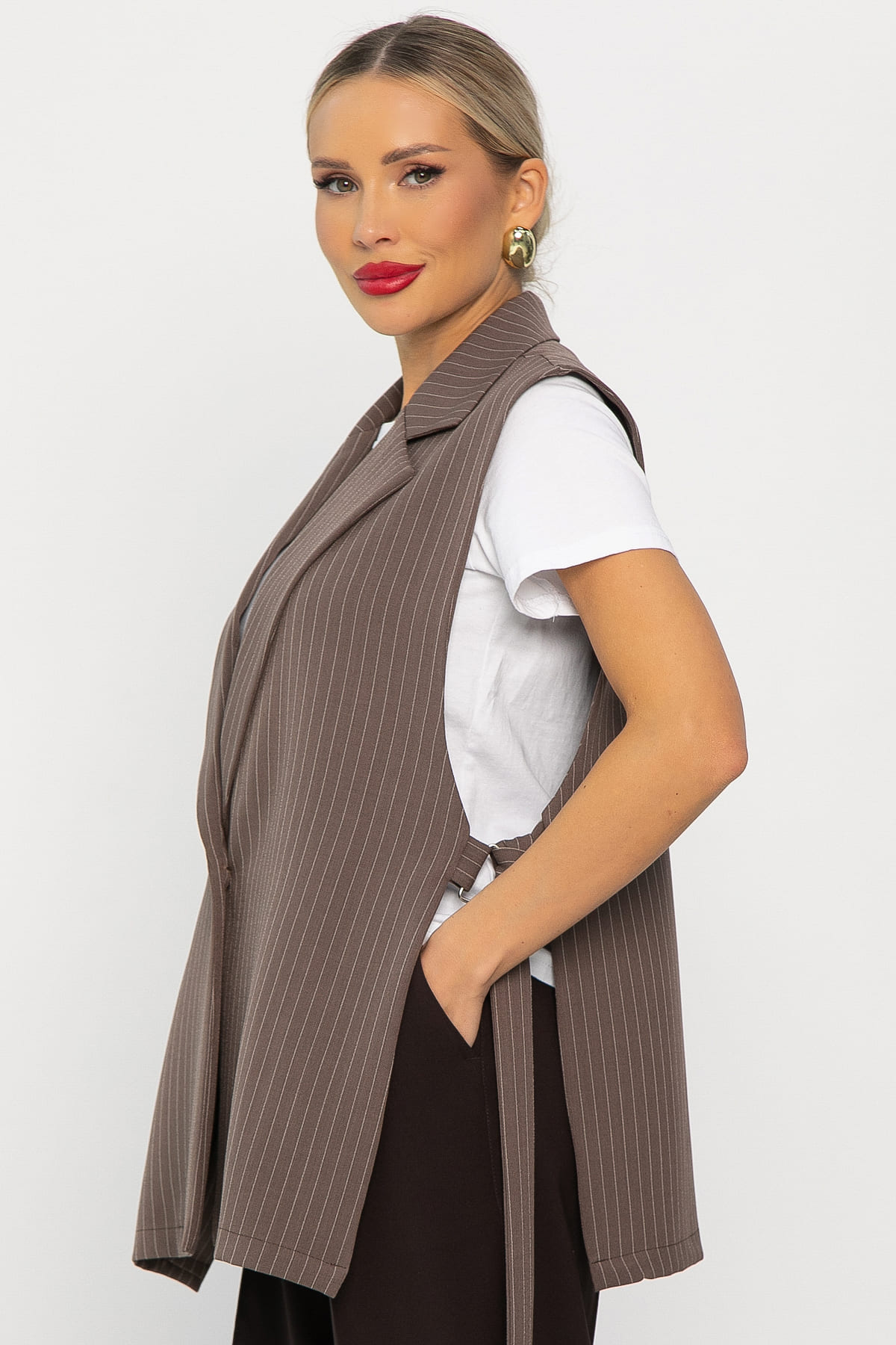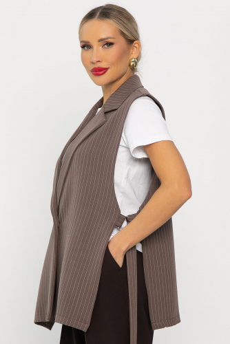 Представляем вашему вниманию женский жилет в классическом стиле кофейного цвета, который станет стильным дополнением к вашему образу! Жилет имеет английский воротник с пуговицей на передней части. По бокам расположены пояса на полукольцах, которые можно завязать на спине. На задней части жилета есть шлица. Жилет не соединён по бокам, но имеет пояс с полукольцами, что придаёт ему особый шарм. Это изделие станет изюминкой вашего гардероба. Сочетайте её с юбкой-карандаш, джинсами, платьем или брюками, чтобы создать неповторимый образ.