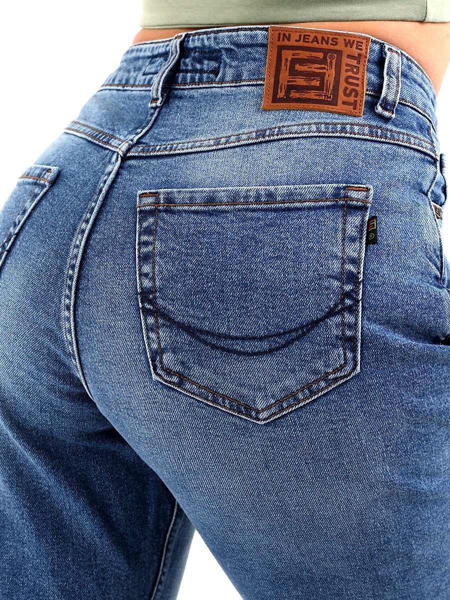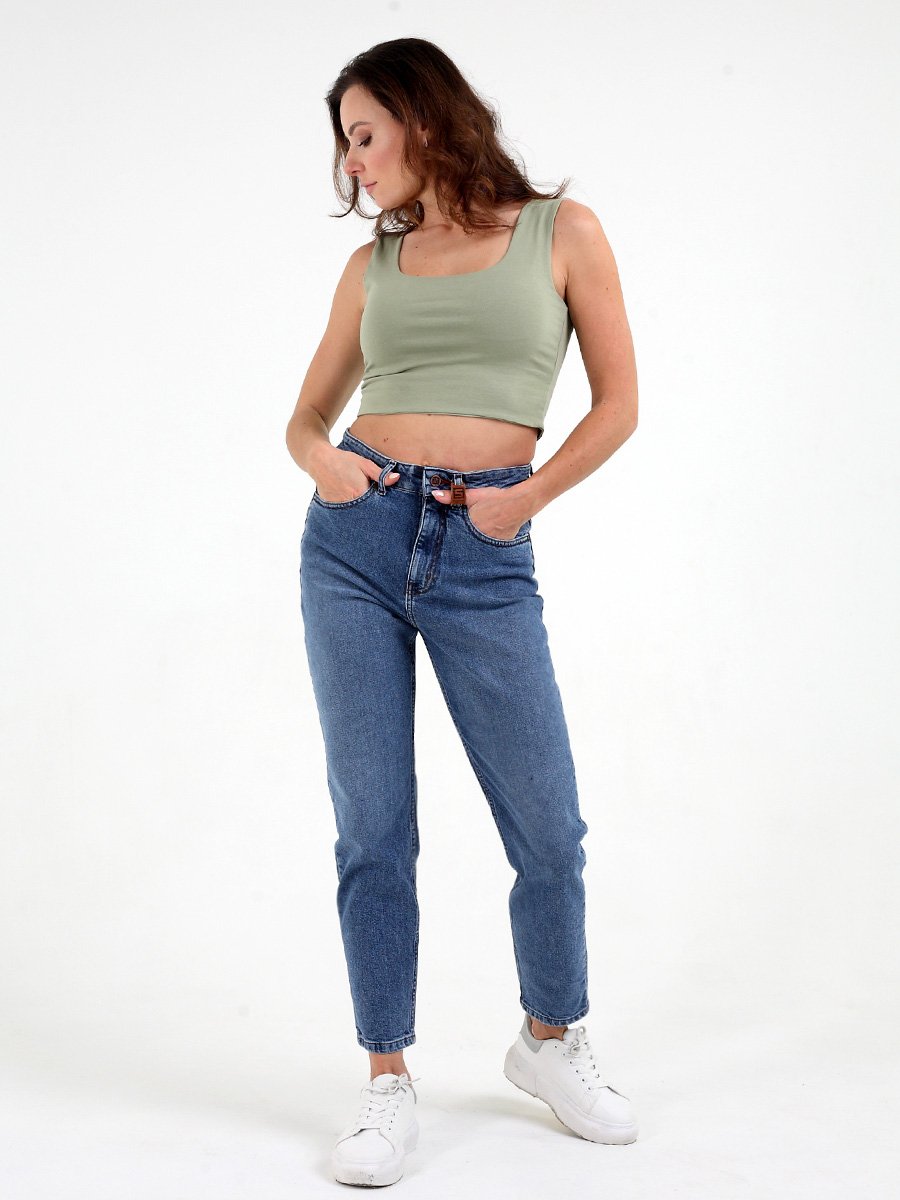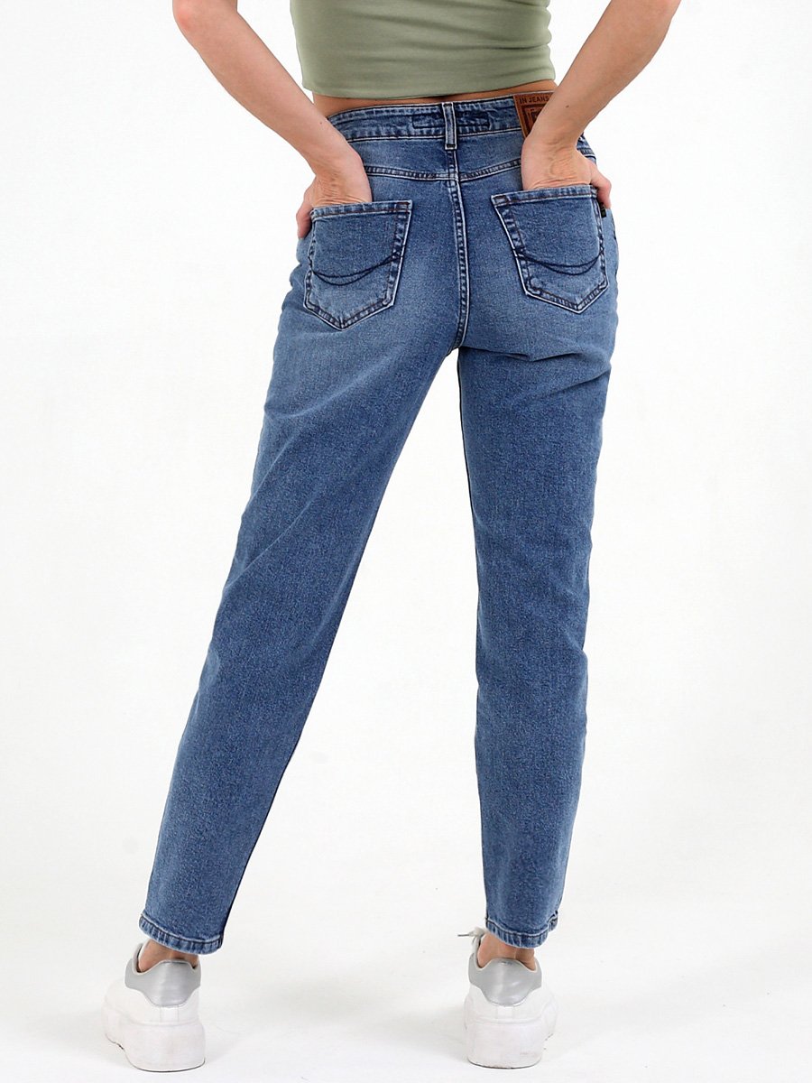 Женские модные джинсы с пятью карманами. Посадка Mom fit (высокая талия), свободные в бедре и зауженные к низу, укороченной длины. Застежка на молнию. Выполнены из слабоэластичной ткани denim comfort stretch. Светлая стирка с потёртостями спереди и сзади. Параметры указаны для размера 28. Длина внутреннего шва - 72 см.