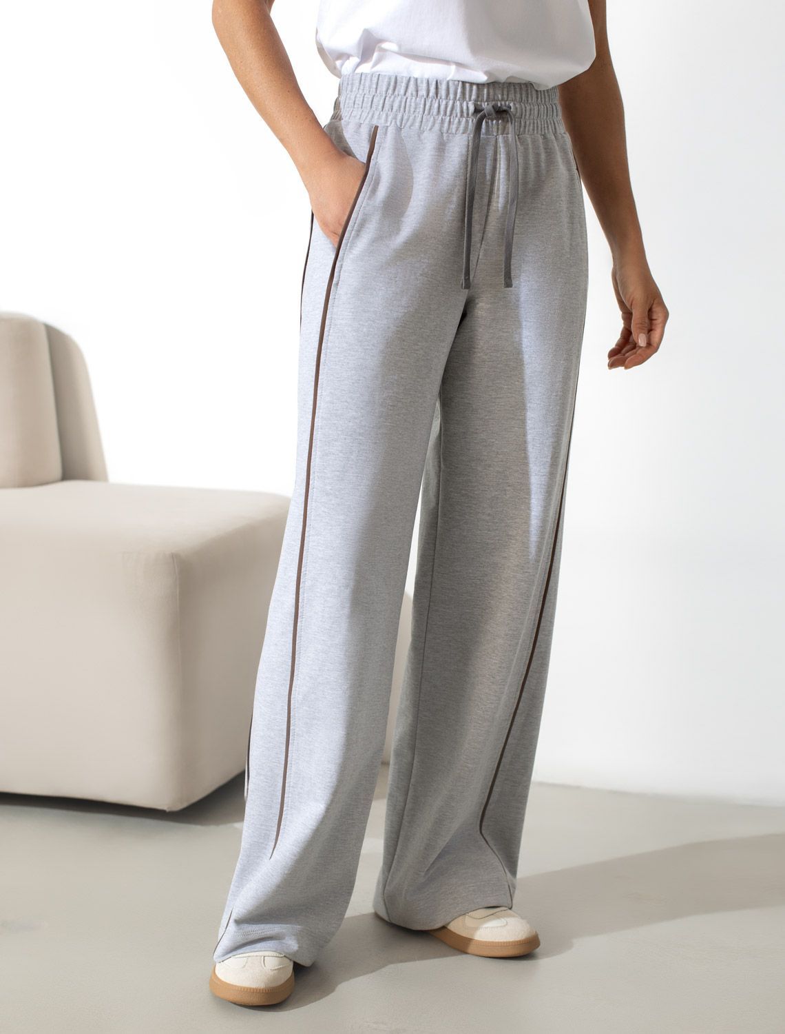 Прямые брюки светло-серого цвета с эффектом меланж выполнены из премиального футера двухнитки с эластаном плотностью 240 Г/м2. Повседневные брюки сочетают в себе комфорт и оригинальность. Брюки выполны из натурального хлопка, который обеспечивает мягкость и дышащие свойства ткани. Нежный материал дарит ощущение уюта в любое время года, а премиальное качество изготовления гарантирует долговечность и сохранение формы после множества стирок. Лампасы добавляют динамики и вытягивают силуэт. Удобный пояс на резинке регулируется хлопковым шнурком. Юлагодаря свободному прямому крою, брюки подойдут на любую фигуру, а так же большие размеры, включая 56. В этих спортивных брюках вы будете чувствовать себя уверенно, наслаждаясь каждым моментом дня.