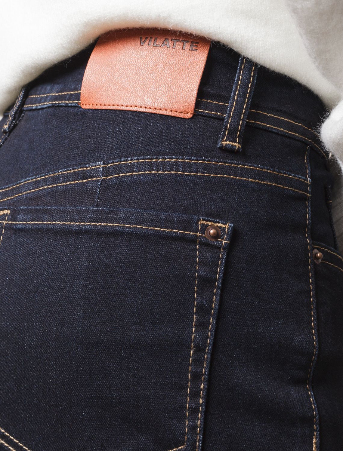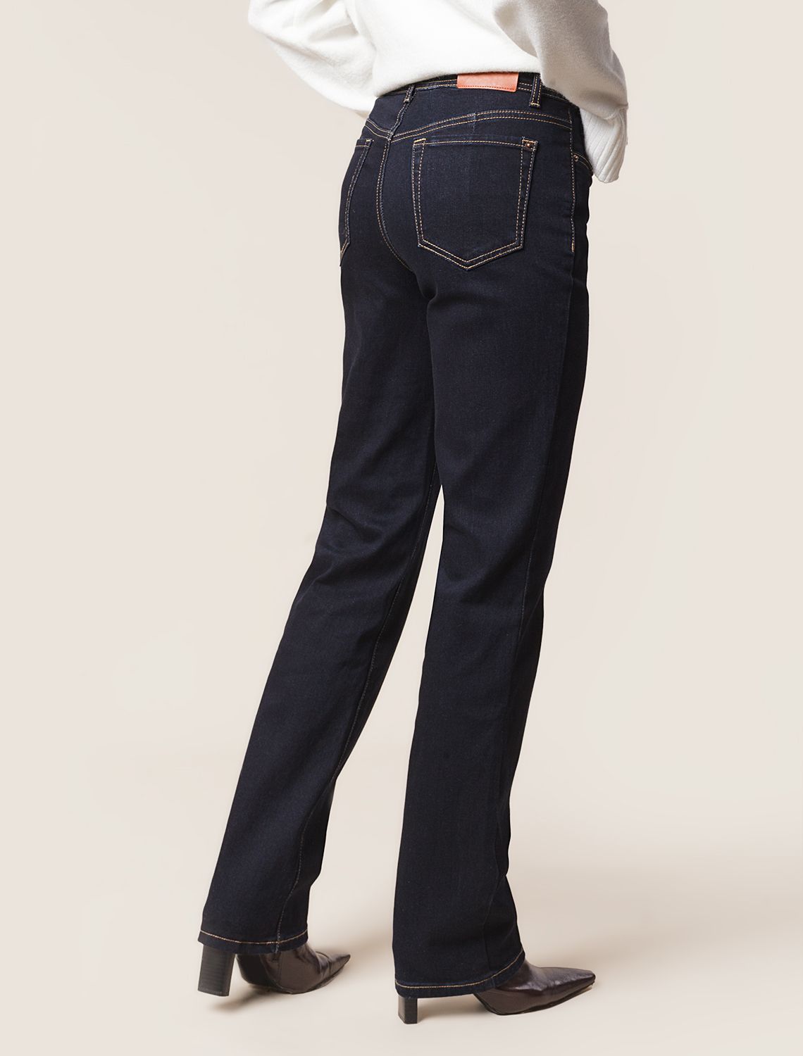 Прямые джинсы выполнены из эластичного денима. Удлиненная модель классического темно-синего цвета с контрастными строчками впишется в любой гардероб. Комфортная посадка на талии подходит для любой фигуры, ткань хорошо тянется и не сковывает движений. На поясе сзади расположен нашивка из эко-кожи с логотипом бренда. Длина изделия позволяет выбрать к образу обувь на каблуке темно-синий