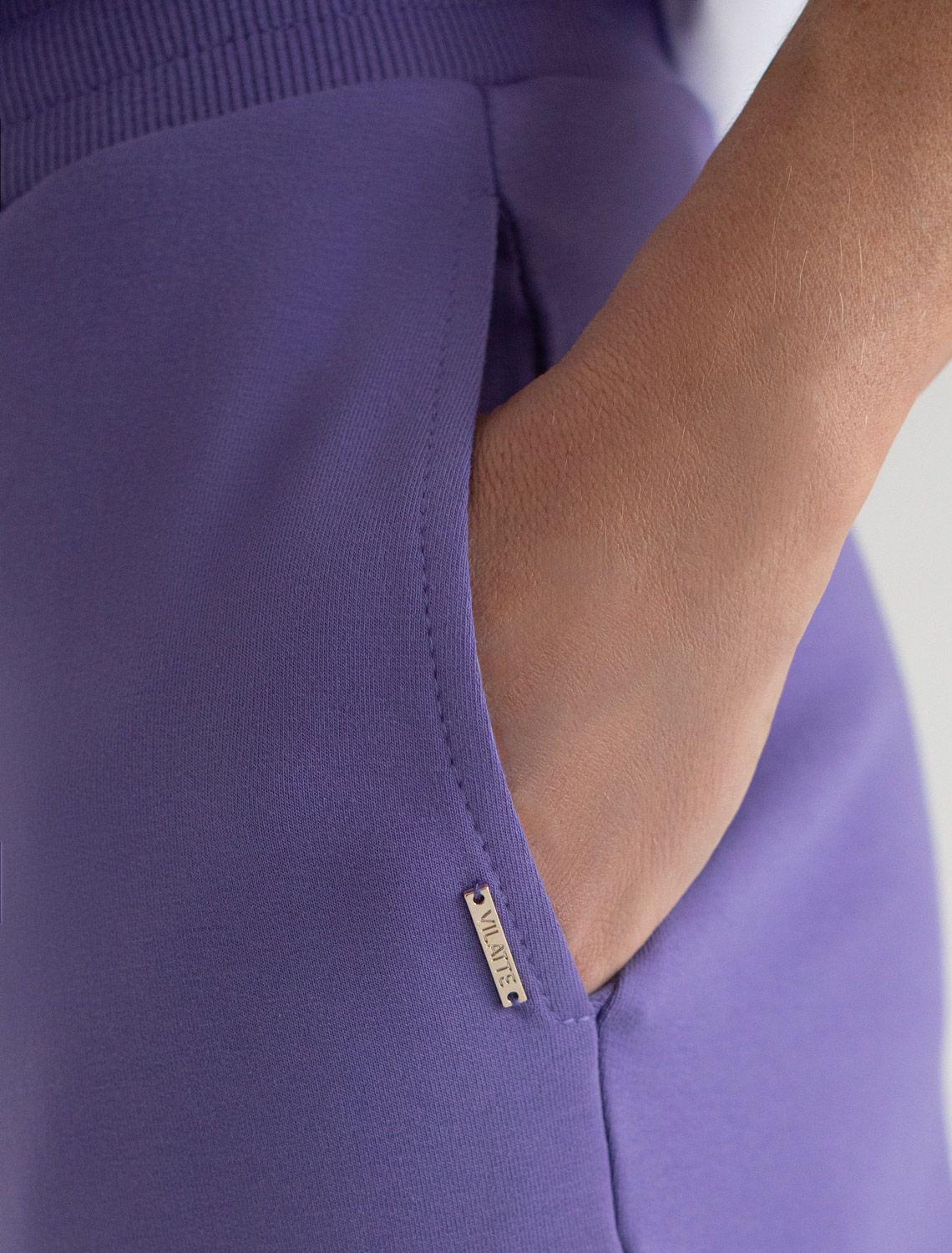 Брюки лавандового цвета прямого кроя выполнены из премиального футера-двухнитки. Лаконичный силуэт поддерживают застроченные стрелки, зрительно вытягивающие силуэт. Удобный пояс на резинке регулируется хлопковым шнурком с золотистой фурнитурой. Наличие эластана в составе изделия гарантирует комфорт и долговечность изделия. Эластичный материал хорошо пропускает воздух, позволяя телу дышать, и легко тянется, не ограничивая движения.