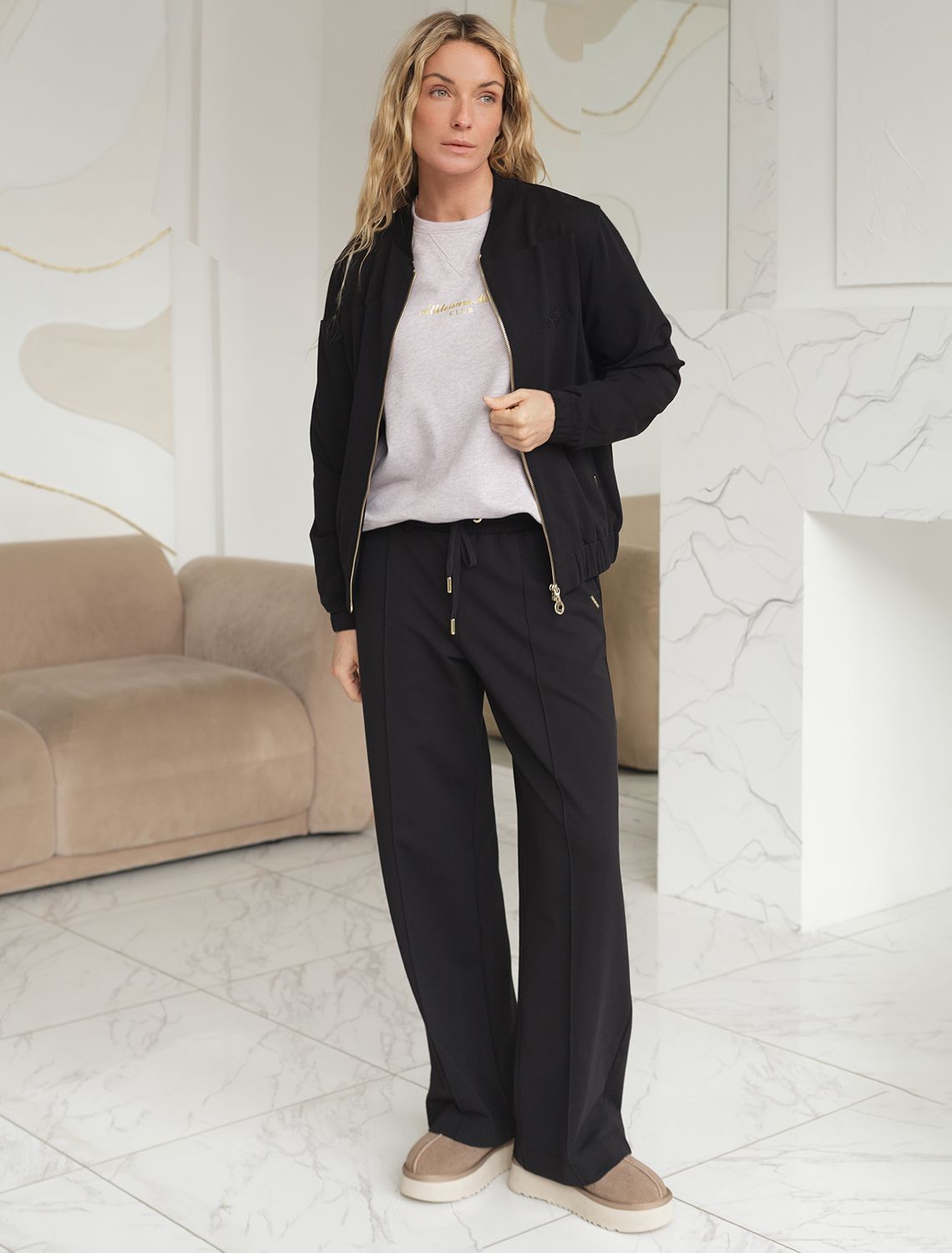 Брюки черного цвета прямого кроя выполнены из премиального футера-двухнитки. Лаконичный силуэт поддерживают застроченные стрелки, зрительно вытягивающие силуэт. Удобный пояс на резинке регулируется хлопковым шнурком с золотистой фурнитурой. Наличие эластана в составе изделия гарантирует комфорт и долговечность изделия. Эластичный материал хорошо пропускает воздух, позволяя телу дышать, и легко тянется, не ограничивая движения.