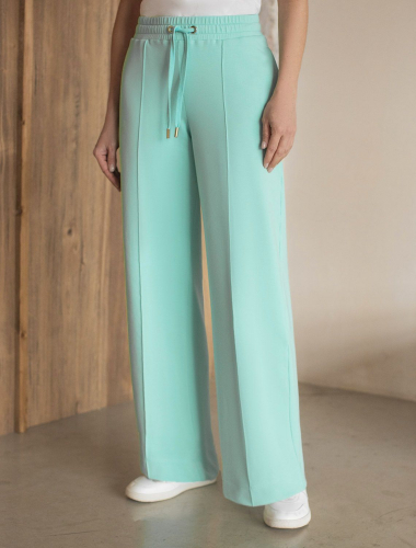 Брюки мятного цвета прямого кроя выполнены из премиального футера-двухнитки. Лаконичный силуэт поддерживают застроченные стрелки, зрительно вытягивающие силуэт. Удобный пояс на резинке регулируется хлопковым шнурком с золотистой фурнитурой. Наличие эластана в составе изделия гарантирует комфорт и долговечность изделия. Эластичный материал хорошо пропускает воздух, позволяя телу дышать, и легко тянется, не ограничивая движения.