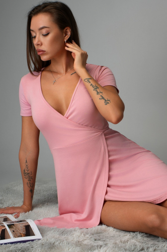 Женское платье-халат выполнено из нежной вискозы. Короткий рукав, крой на запах, аккуратная длина мини и шикарный V-образный вырез делают платье для женщин не только максимально удобным, но и элегантным. Однотонное летнее платье представлено в лаконичном пудровом цвете.