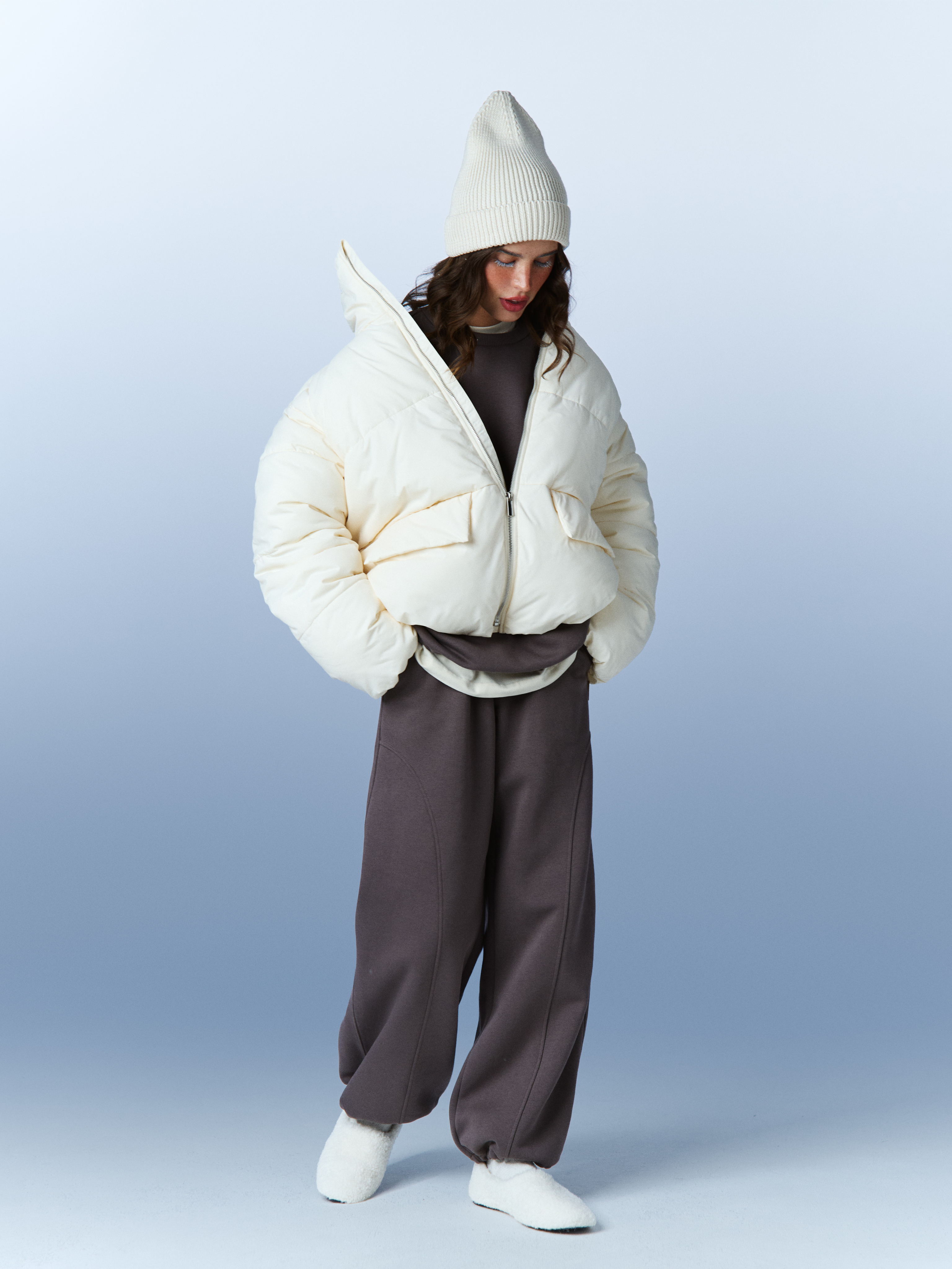 По низу изделия утяжка на шляпную резинку с фиксаторами – легко менять силуэт, легко регулируется, надёжно удерживает тепло и защищает от снега и ветра.