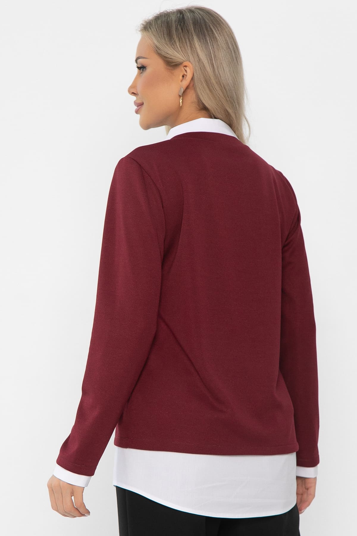 Джемпер из мягкого трикотажа в вишневом цвете станет стильным акцентом вашего делового гардероба. Он добавит элегантности и комфорта любому образу. Сочетание двух видов ткани создаёт эффект многослойного образа. Рукав втачной, длинный. Отлично будет смотреться такой джемпер как с джинсами, так и с любым классическим низом. Воротник, низ изделия и манжеты на рукавах выполнены из хлопка.