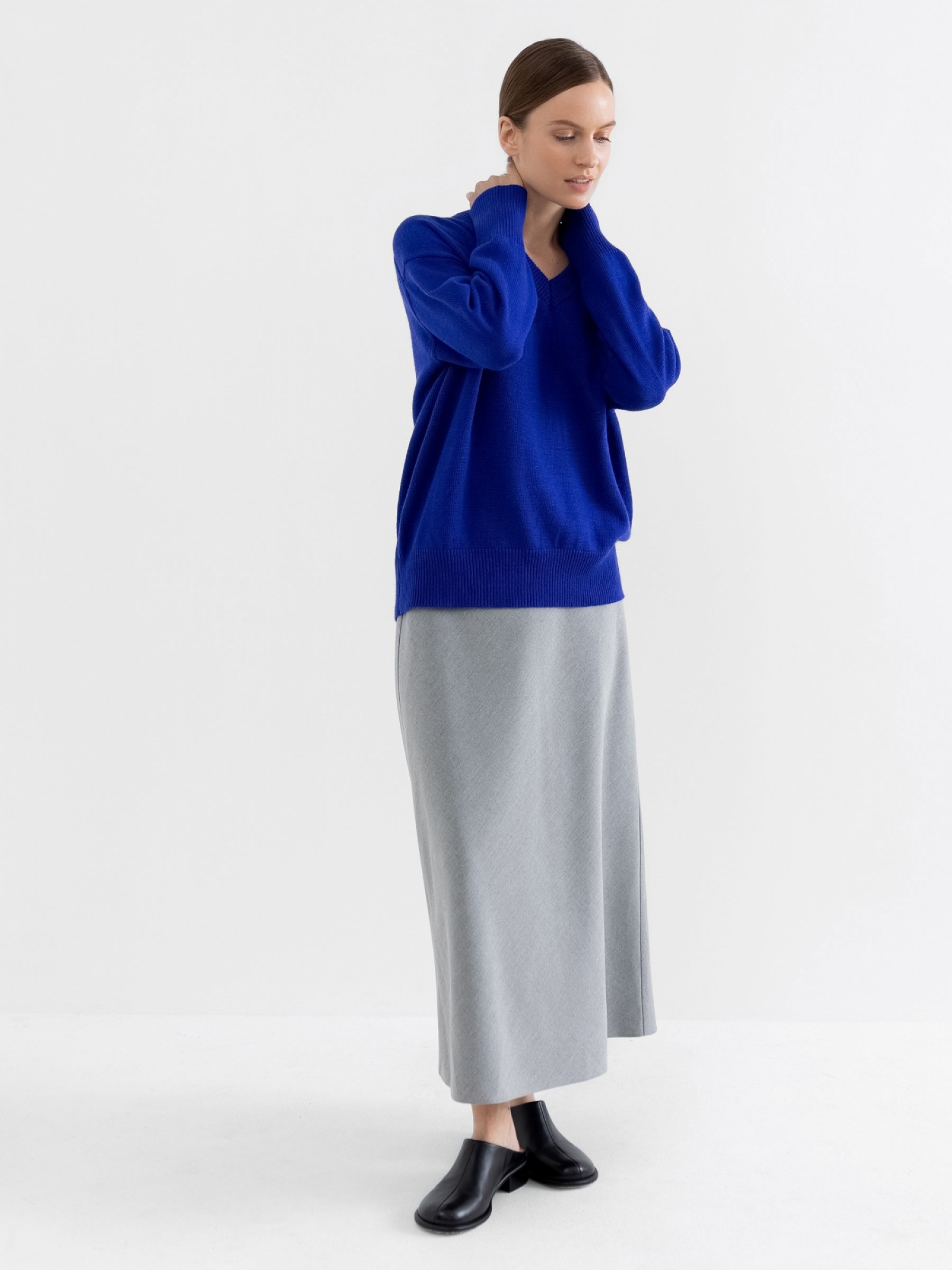 Чтобы выглядеть безупречно и ощущать максимальный комфорт, достаточно этого базового пуловера. У него лаконичный расслабленный дизайн и ровные универсальные цвета, поэтому вы легко подберете нужный низ. Из деталей отметим аккуратный V-образный вырез, оформление манжет и низа фактурной резинкой и теплое обволакивающее полотно с добавлением ангоры. Носите соло, поверх водолазки или футболки.