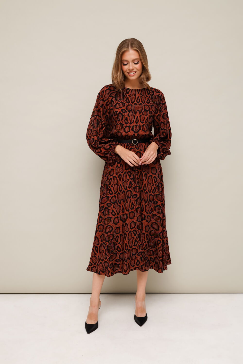 Платье отрезное по линии талии на резинке, выполнено из вискозы с анималистичным принтом. Горловина с окантованным вырезом горловины. Рукава-реглан, в длине 3/4 собраны на резинку по низу. По спинке обработан разрез с застежкой в среднем шве на навесную петлю и пуговицу. В комплекте прилагается съемный ремень.